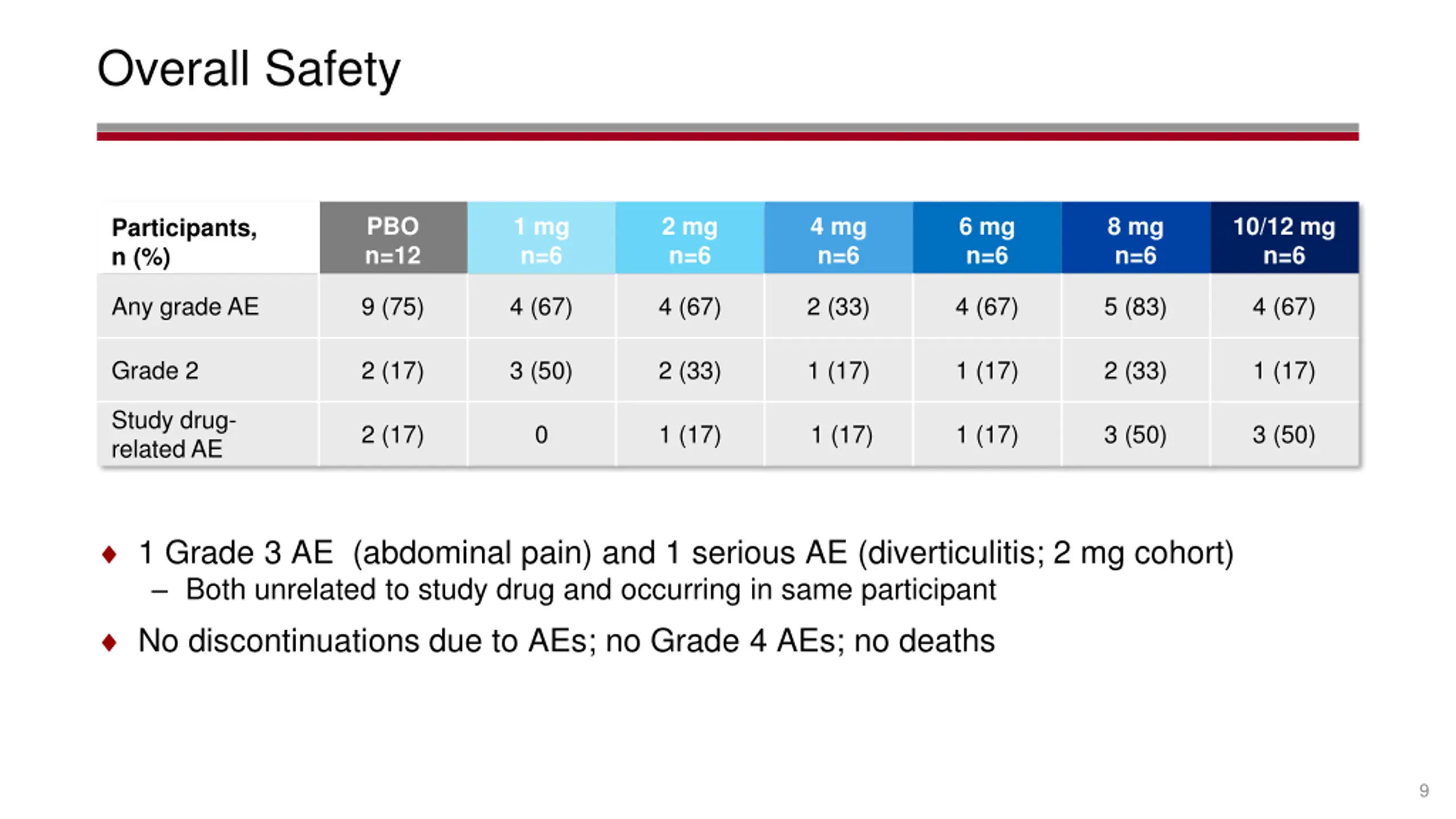 Overall Safety PBO n=12 1 mg n=6 2 mg n=6 4 mg n=6 6 mg n=6 8 mg n=6 10/12 mg n=6 Participants, n (%) Any grade AE 9 (75) 4 (67) 4 (67) 2 (33) 4 (67) 5 (83) 4 (67) Grade 2 2 (17) 3 (50) 2 (33) 1 (17) 1 (17) 2 (33) 1 (17) Study drug- related AE 2 (17) 0 1 (17) 1 (17) 1 (17) 3 (50) 3 (50) 1 Grade 3 AE (abdominal pain) and 1 serious AE (diverticulitis; 2 mg cohort) Both unrelated to study drug and occurring in same participant No discontinuations due to AEs; no Grade 4 AEs; no deaths 9