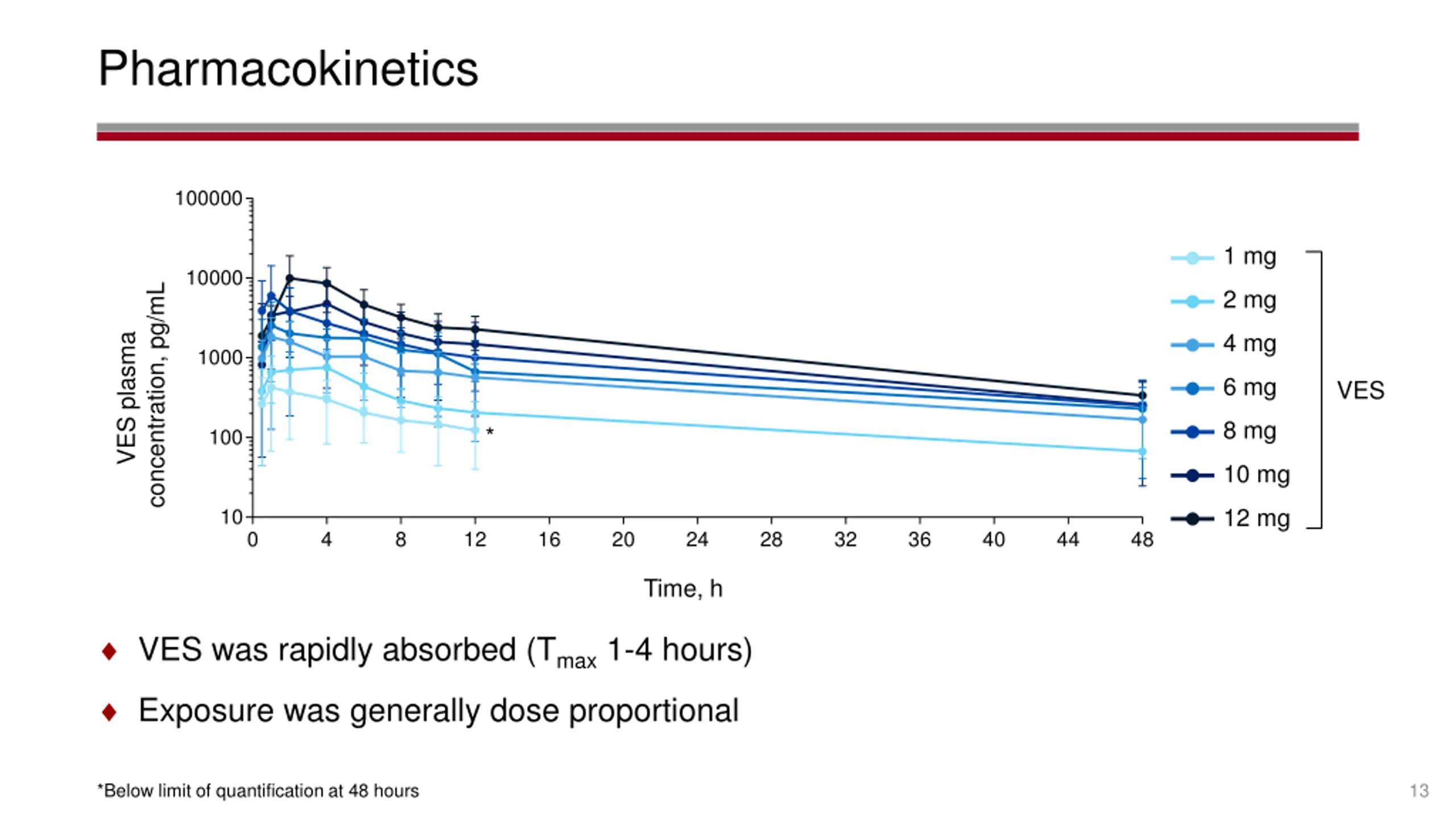 Pharmacokinetics 100000 1 mg 10000 concentration, pg/mL 2 mg 4 mg VES plasma 1000 6 mg VES 8 mg * 100 10 mg 12 mg 10 0 4 8 12 16 20 24 28 32 36 40 44 48 Time, h VES was rapidly absorbed (Tmax 1-4 hours) Exposure was generally dose proportional *Below limit of quantification at 48 hours 13