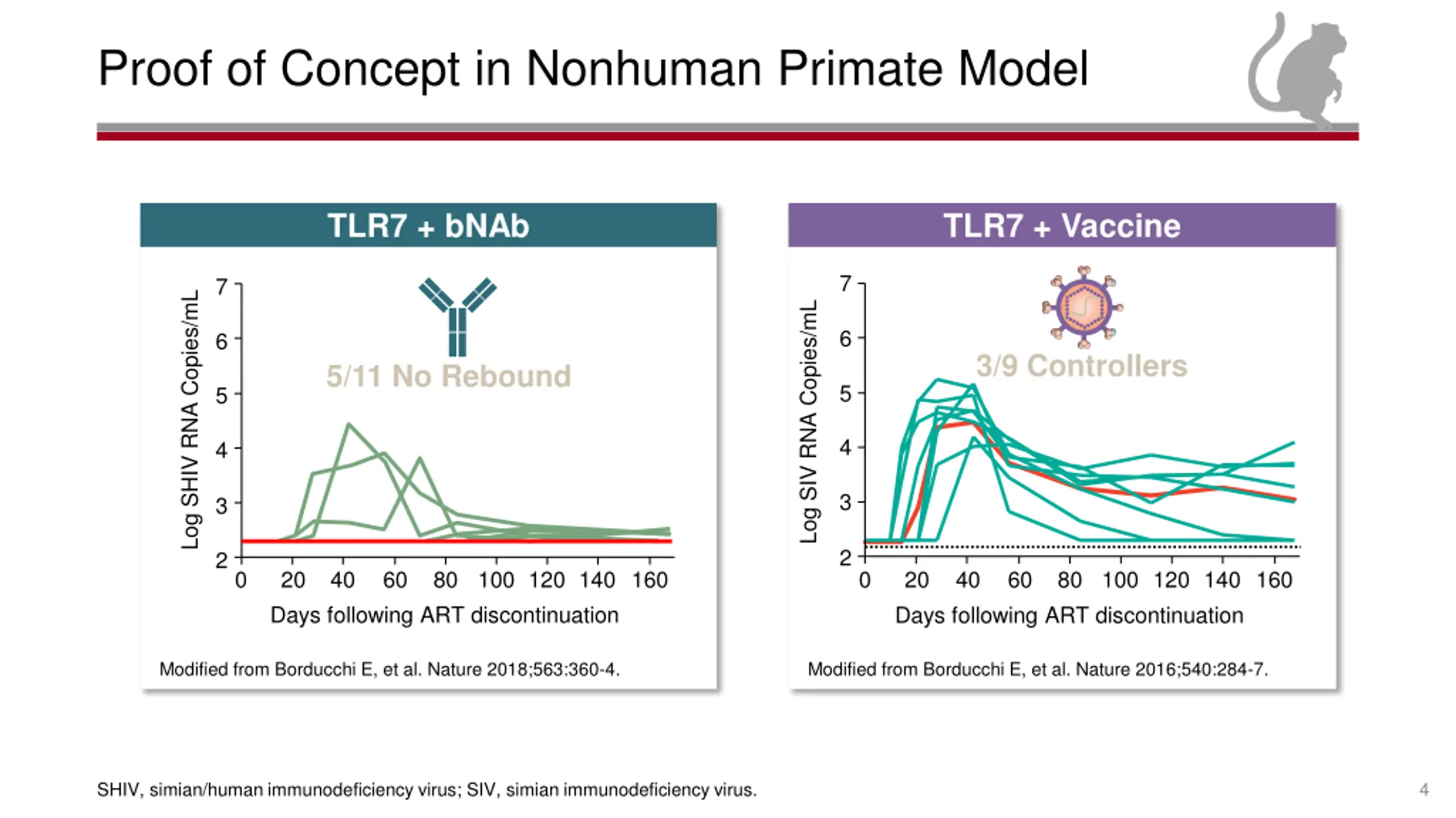 Immune-Based Strategies to Eliminate HIV Reservoirs Protect ART Vesatolimod (TLR7 agonist) Eliminate Activate Infected CD4 T cells Vaccines bNAb Vesatolimod (TLR7 agonist) Recruit immune cells NK cells M s T cells Combine TLR7 agonist, bNAbs, therapeutic vaccine Goal ART, antiretroviral therapy; bNAb, broadly neutralizing antibody; M s, macrophages; NK, natural killer; TLR7, toll-like receptor-7. 3