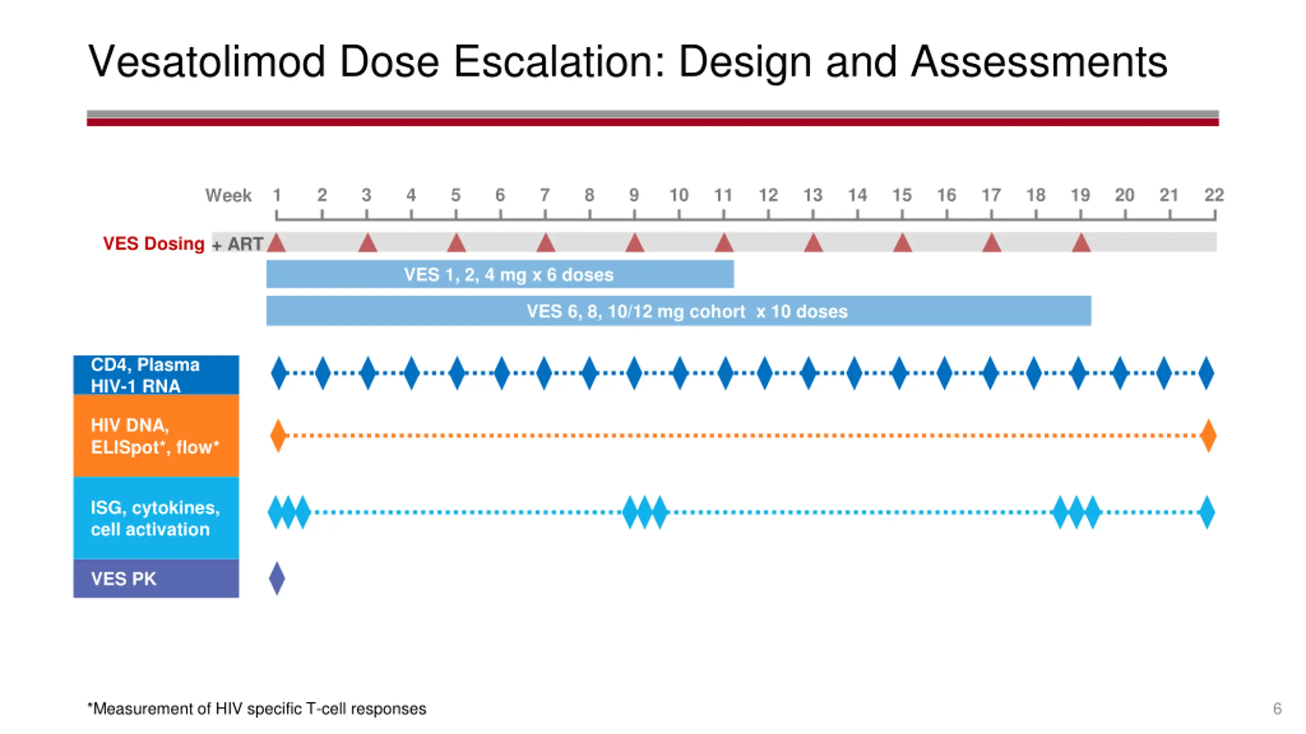 Vesatolimod Dose Escalation: Design and Assessments 1 2 3 4 5 6 7 8 9 10 11 12 13 14 15 16 17 18 19 20 21 22 Week VES Dosing + ART VES 1, 2, 4 mg x 6 doses VES 6, 8, 10/12 mg cohort x 10 doses CD4, Plasma HIV-1 RNA HIV DNA, ELISpot*, flow* ISG, cytokines, cell activation VES PK *Measurement of HIV specific T-cell responses 6