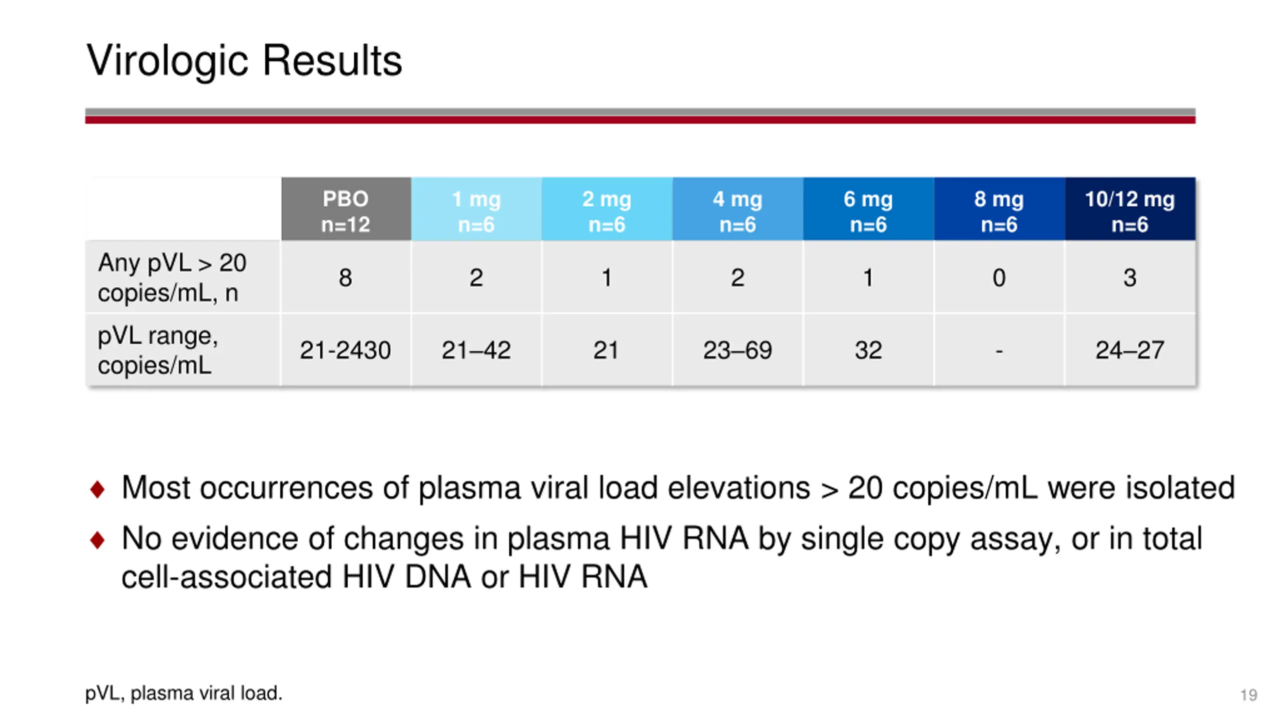 Virologic Results PBO n=12 1 mg n=6 2 mg n=6 4 mg n=6 6 mg n=6 8 mg n=6 10/12 mg n=6 Any pVL > 20 copies/mL, n 8 2 1 2 1 0 3 pVL range, copies/mL 21-2430 21 42 21 23 69 32 - 24 27 Most occurrences of plasma viral load elevations > 20 copies/mL were isolated No evidence of changes in plasma HIV RNA by single copy assay, or in total cell-associated HIV DNA or HIV RNA pVL, plasma viral load. 19