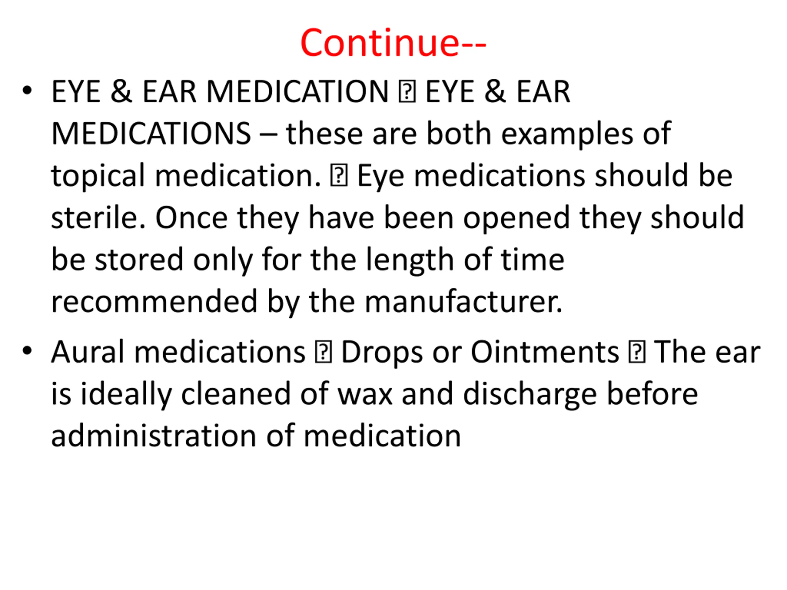 Continue-- EYE & EAR MEDICATION EYE & EAR MEDICATIONS these are both examples of topical medication. Eye medications should be sterile. Once they have been opened they should be stored only for the length of time recommended by the manufacturer. Aural medications Drops or Ointments The ear is ideally cleaned of wax and discharge before administration of medication