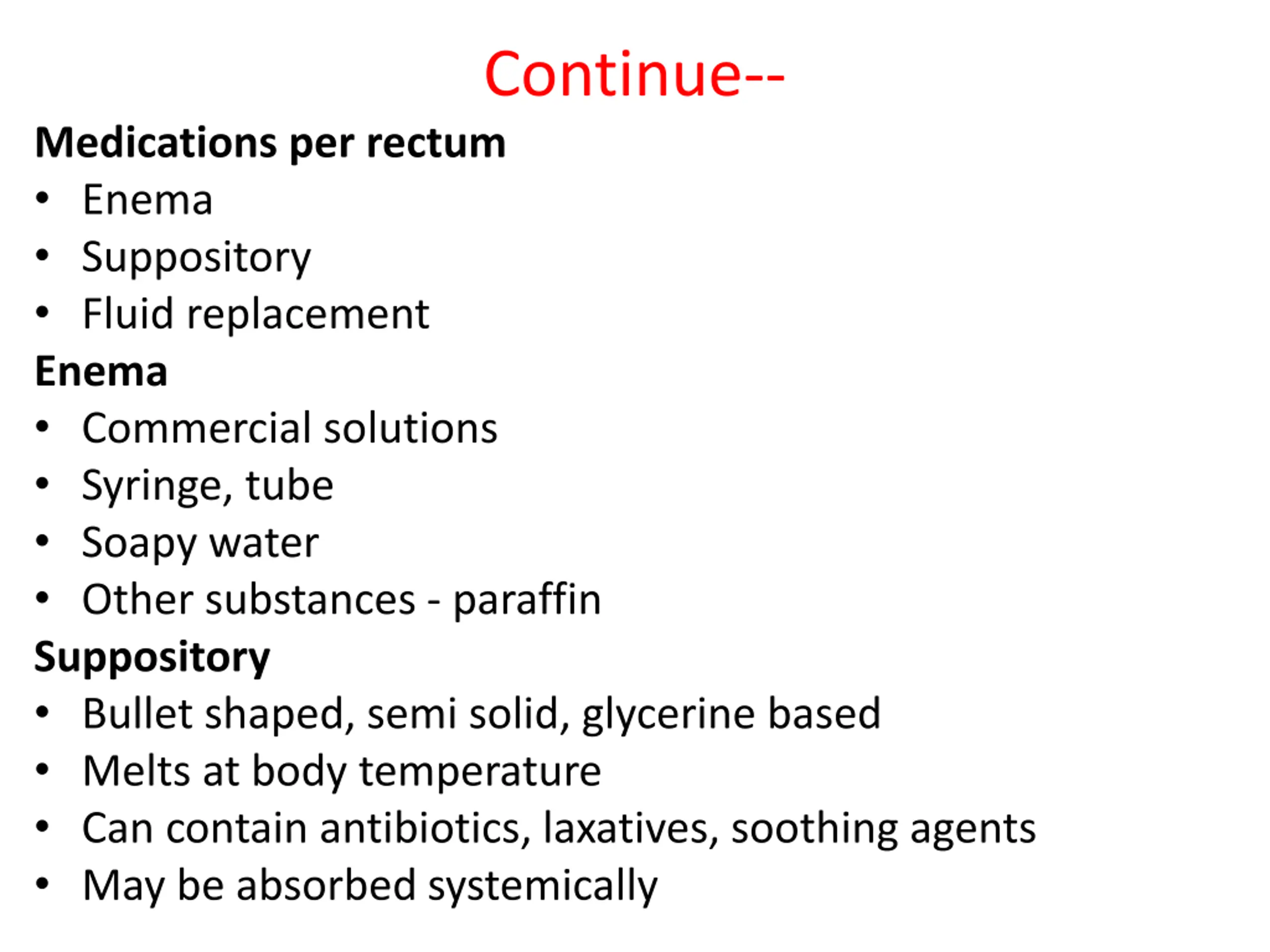 Continue-- Medications per rectum Enema Suppository Fluid replacement Enema Commercial solutions Syringe, tube Soapy water Other substances - paraffin Suppository Bullet shaped, semi solid, glycerine based Melts at body temperature Can contain antibiotics, laxatives, soothing agents May be absorbed systemically