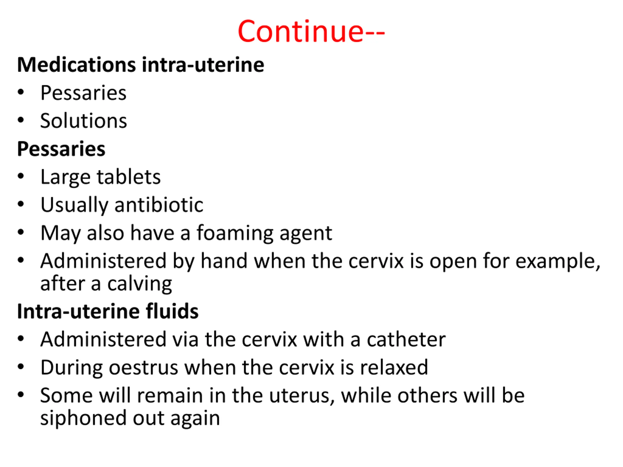 Continue-- Medications intra-uterine Pessaries Solutions Pessaries Large tablets Usually antibiotic May also have a foaming agent Administered by hand when the cervix is open for example, after a calving Intra-uterine fluids Administered via the cervix with a catheter During oestrus when the cervix is relaxed Some will remain in the uterus, while others will be siphoned out again