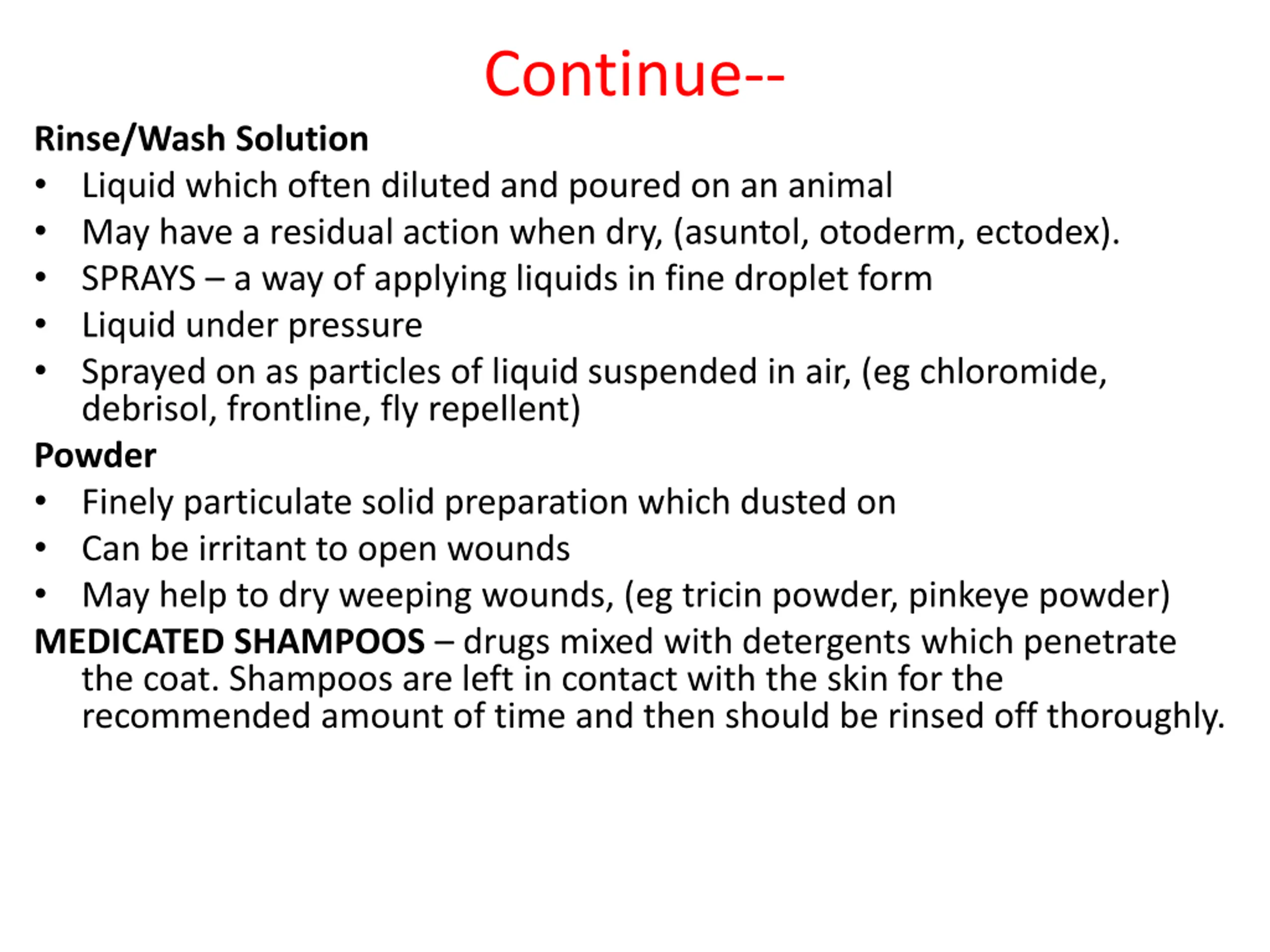 Continue-- Rinse/Wash Solution Liquid which often diluted and poured on an animal May have a residual action when dry, (asuntol, otoderm, ectodex). SPRAYS a way of applying liquids in fine droplet form Liquid under pressure Sprayed on as particles of liquid suspended in air, (eg chloromide, debrisol, frontline, fly repellent) Powder Finely particulate solid preparation which dusted on Can be irritant to open wounds May help to dry weeping wounds, (eg tricin powder, pinkeye powder) MEDICATED SHAMPOOS drugs mixed with detergents which penetrate the coat. Shampoos are left in contact with the skin for the recommended amount of time and then should be rinsed off thoroughly.