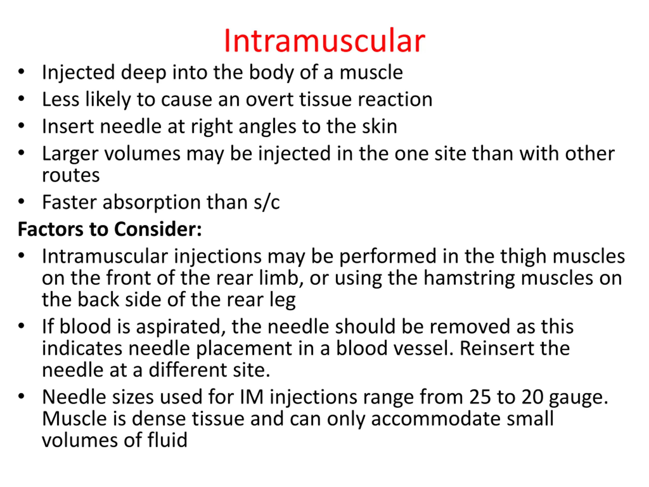 Intramuscular Injected deep into the body of a muscle Less likely to cause an overt tissue reaction Insert needle at right angles to the skin Larger volumes may be injected in the one site than with other routes Faster absorption than s/c Factors to Consider: Intramuscular injections may be performed in the thigh muscles on the front of the rear limb, or using the hamstring muscles on the back side of the rear leg If blood is aspirated, the needle should be removed as this indicates needle placement in a blood vessel. Reinsert the needle at a different site. Needle sizes used for IM injections range from 25 to 20 gauge. Muscle is dense tissue and can only accommodate small volumes of fluid