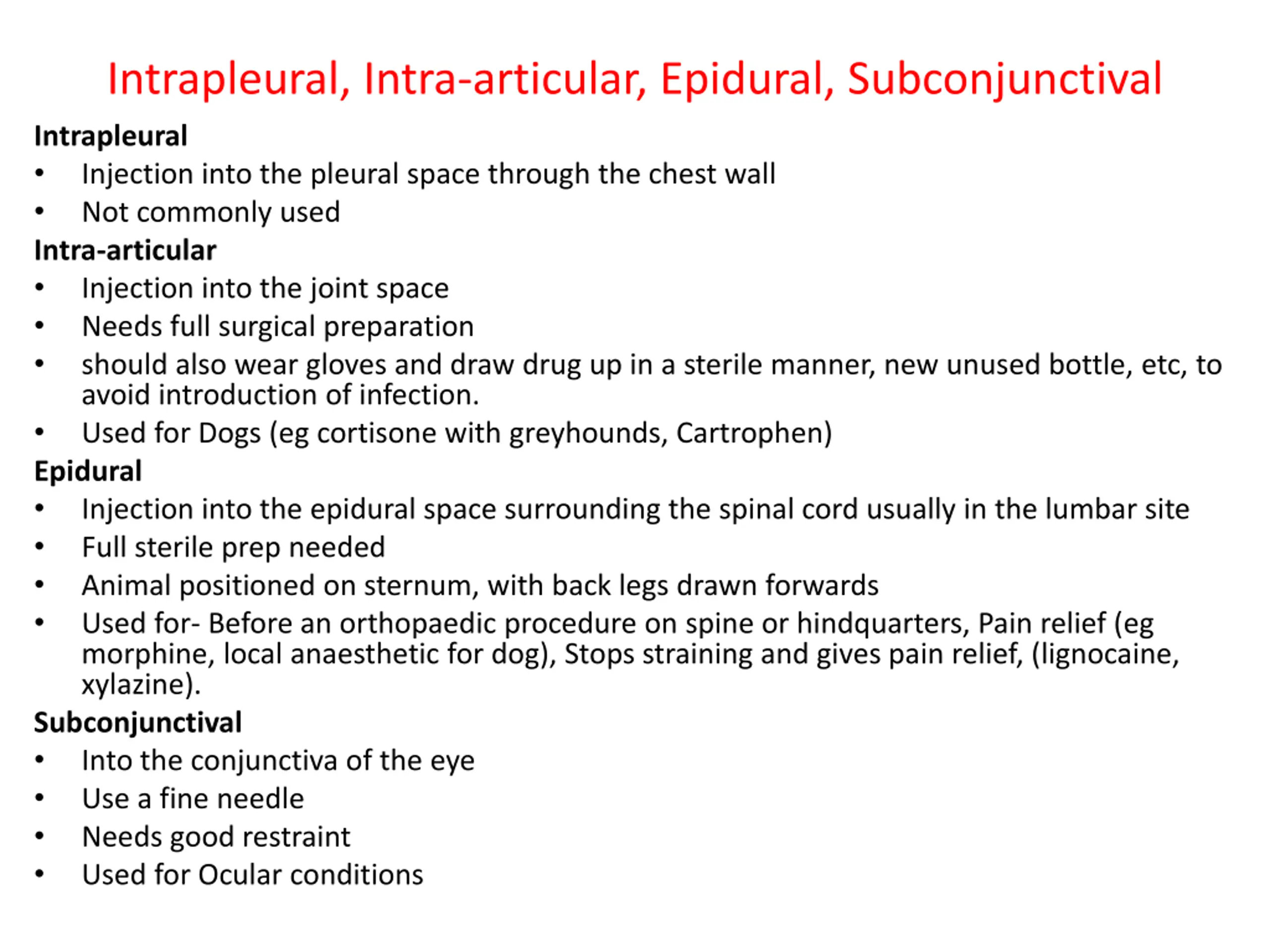 Intrapleural, Intra-articular, Epidural, Subconjunctival Intrapleural Injection into the pleural space through the chest wall Not commonly used Intra-articular Injection into the joint space Needs full surgical preparation should also wear gloves and draw drug up in a sterile manner, new unused bottle, etc, to avoid introduction of infection. Used for Dogs (eg cortisone with greyhounds, Cartrophen) Epidural Injection into the epidural space surrounding the spinal cord usually in the lumbar site Full sterile prep needed Animal positioned on sternum, with back legs drawn forwards Used for- Before an orthopaedic procedure on spine or hindquarters, Pain relief (eg morphine, local anaesthetic for dog), Stops straining and gives pain relief, (lignocaine, xylazine). Subconjunctival Into the conjunctiva of the eye Use a fine needle Needs good restraint Used for Ocular conditions