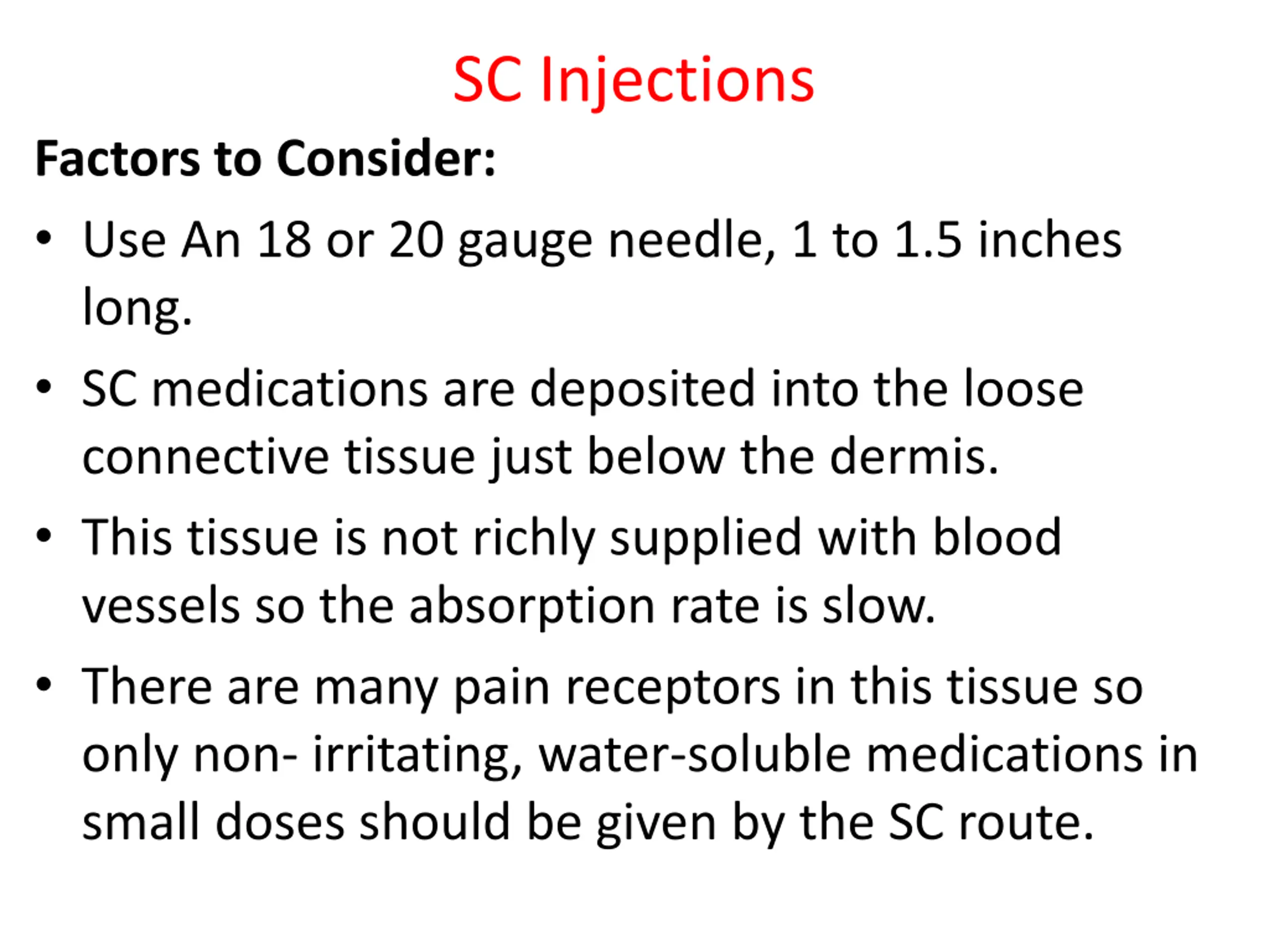 SC Injections Factors to Consider: Use An 18 or 20 gauge needle, 1 to 1.5 inches long. SC medications are deposited into the loose connective tissue just below the dermis. This tissue is not richly supplied with blood vessels so the absorption rate is slow. There are many pain receptors in this tissue so only non- irritating, water-soluble medications in small doses should be given by the SC route.