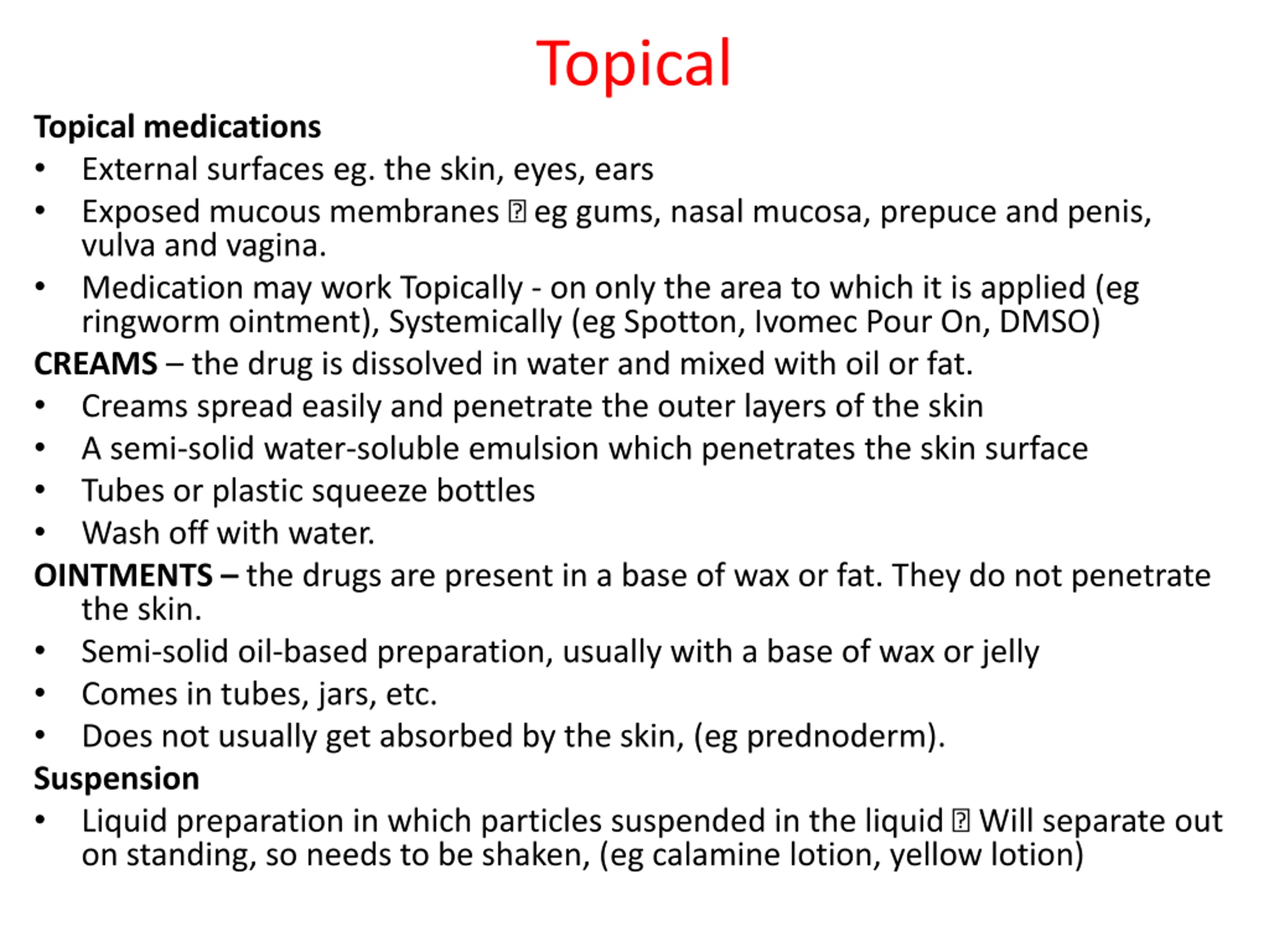 Topical Topical medications External surfaces eg. the skin, eyes, ears Exposed mucous membranes eg gums, nasal mucosa, prepuce and penis, vulva and vagina. Medication may work Topically - on only the area to which it is applied (eg ringworm ointment), Systemically (eg Spotton, Ivomec Pour On, DMSO) CREAMS the drug is dissolved in water and mixed with oil or fat. Creams spread easily and penetrate the outer layers of the skin A semi-solid water-soluble emulsion which penetrates the skin surface Tubes or plastic squeeze bottles Wash off with water. OINTMENTS the drugs are present in a base of wax or fat. They do not penetrate the skin. Semi-solid oil-based preparation, usually with a base of wax or jelly Comes in tubes, jars, etc. Does not usually get absorbed by the skin, (eg prednoderm). Suspension Liquid preparation in which particles suspended in the liquid Will separate out on standing, so needs to be shaken, (eg calamine lotion, yellow lotion)