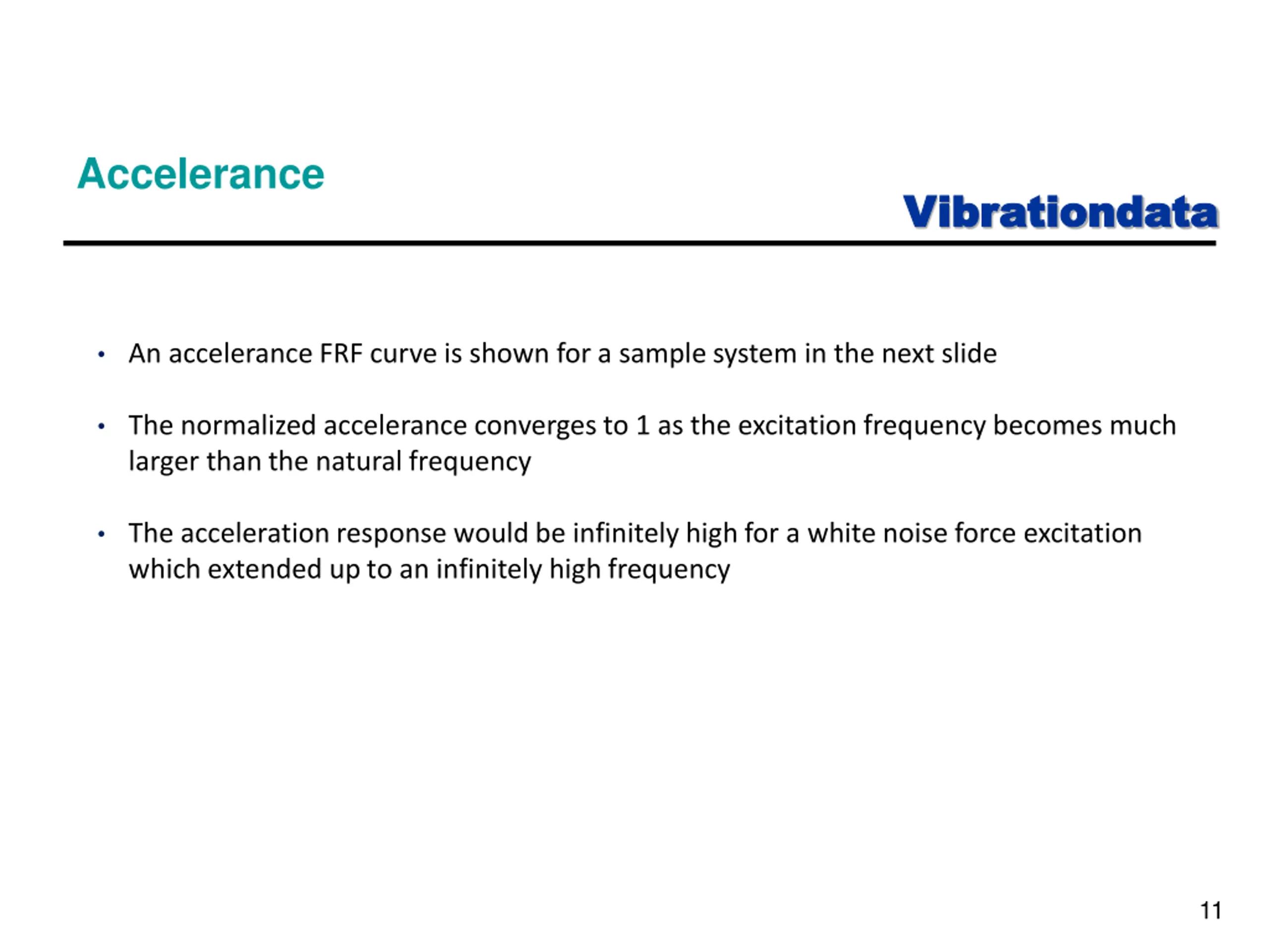 Accelerance Vibrationdata Vibrationdata An accelerance FRF curve is shown for a sample system in the next slide The normalized accelerance converges to 1 as the excitation frequency becomes much larger than the natural frequency The acceleration response would be infinitely high for a white noise force excitation which extended up to an infinitely high frequency 11