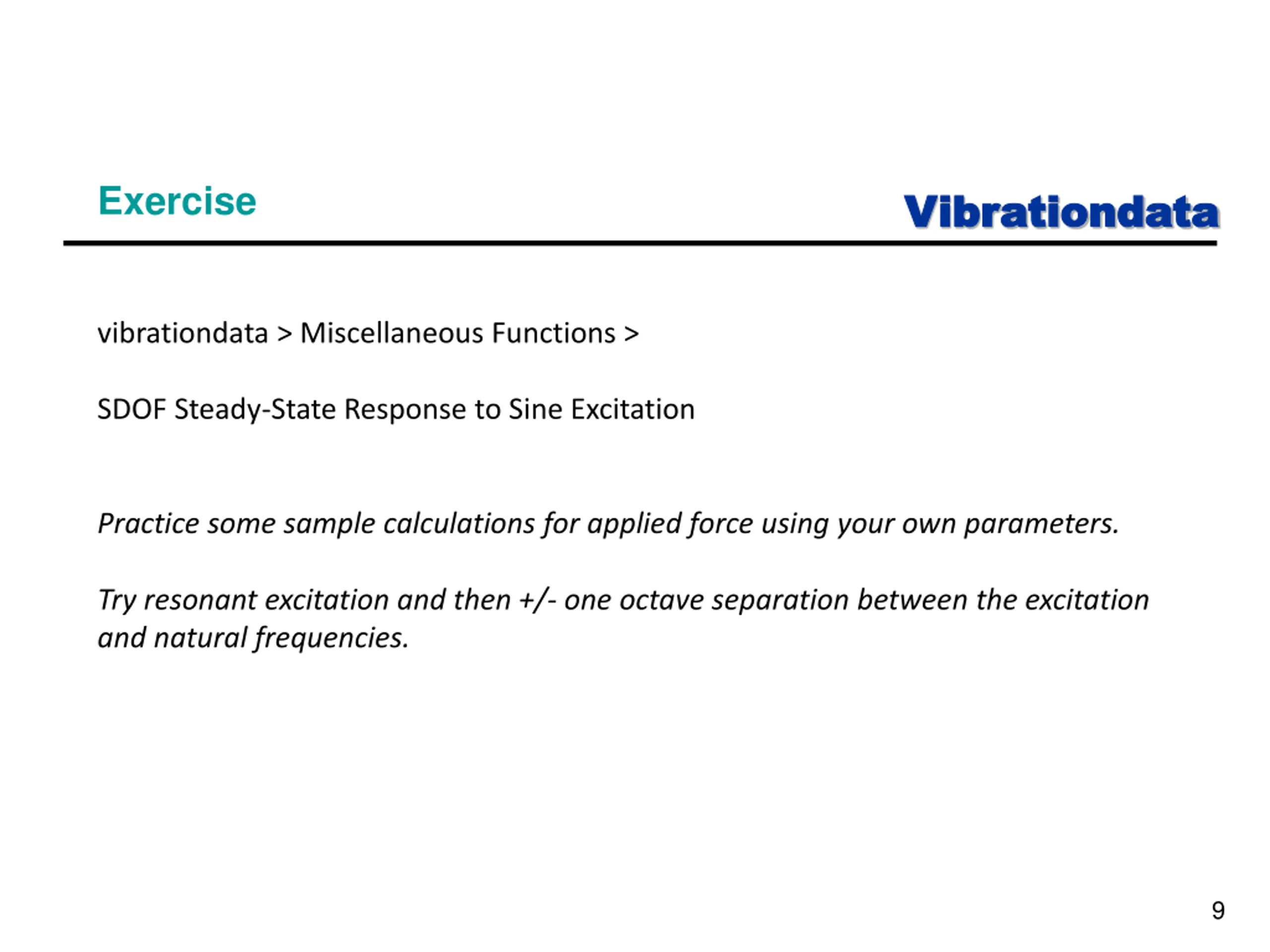 Exercise Vibrationdata Vibrationdata vibrationdata > Miscellaneous Functions > SDOF Steady-State Response to Sine Excitation Practice some sample calculations for applied force using your own parameters. Try resonant excitation and then +/- one octave separation between the excitation and natural frequencies. 9
