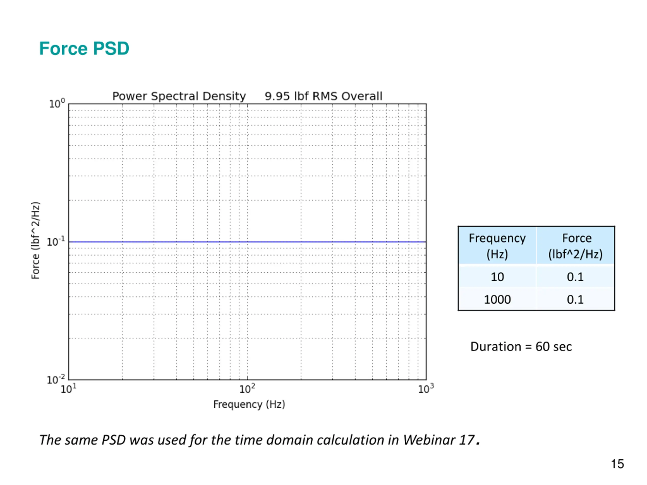 Force PSD Vibrationdata Vibrationdata Frequency (Hz) Force (lbf^2/Hz) 10 0.1 1000 0.1 Duration = 60 sec The same PSD was used for the time domain calculation in Webinar 17. 15