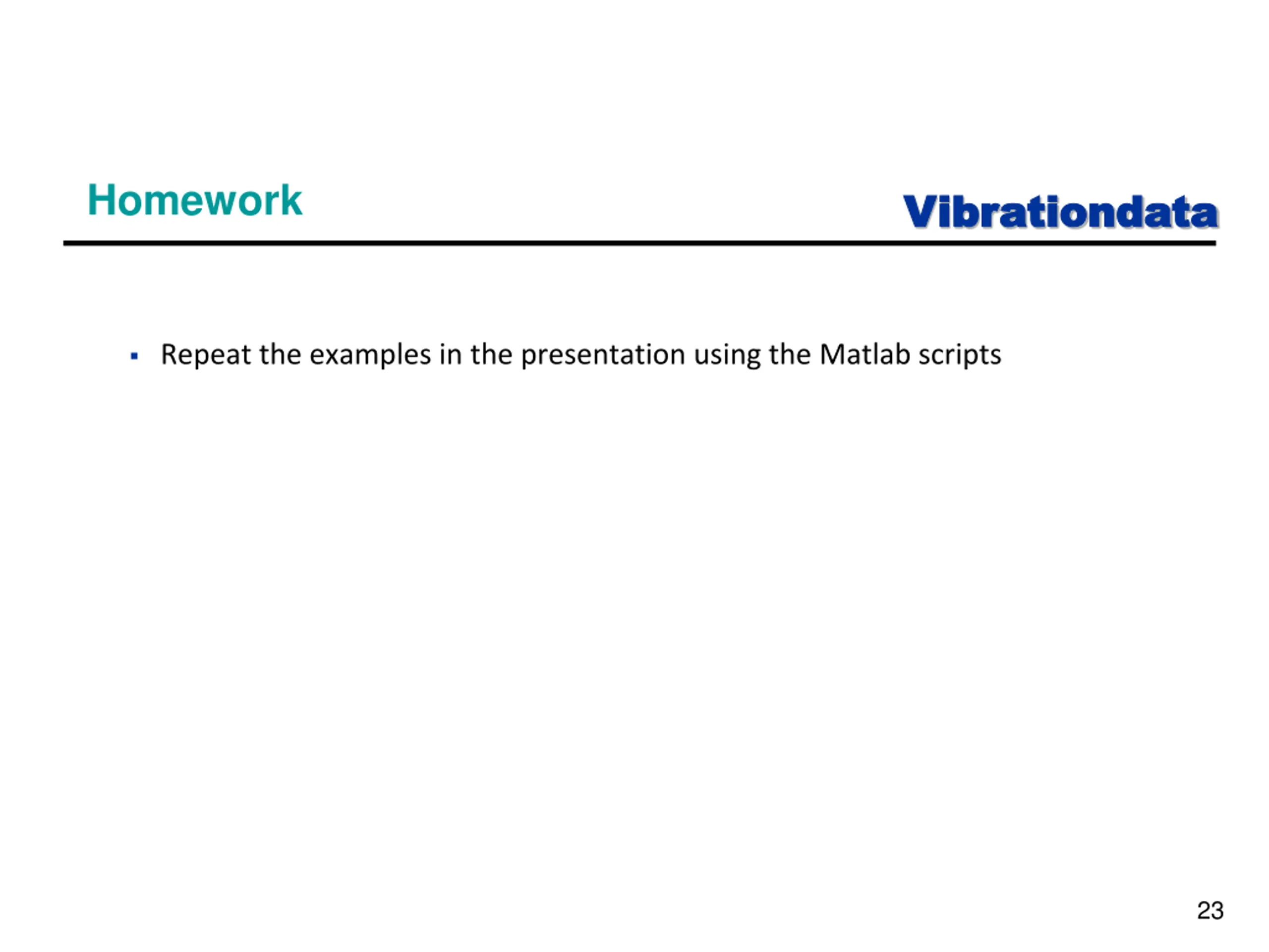 Homework Vibrationdata Vibrationdata Repeat the examples in the presentation using the Matlab scripts 23