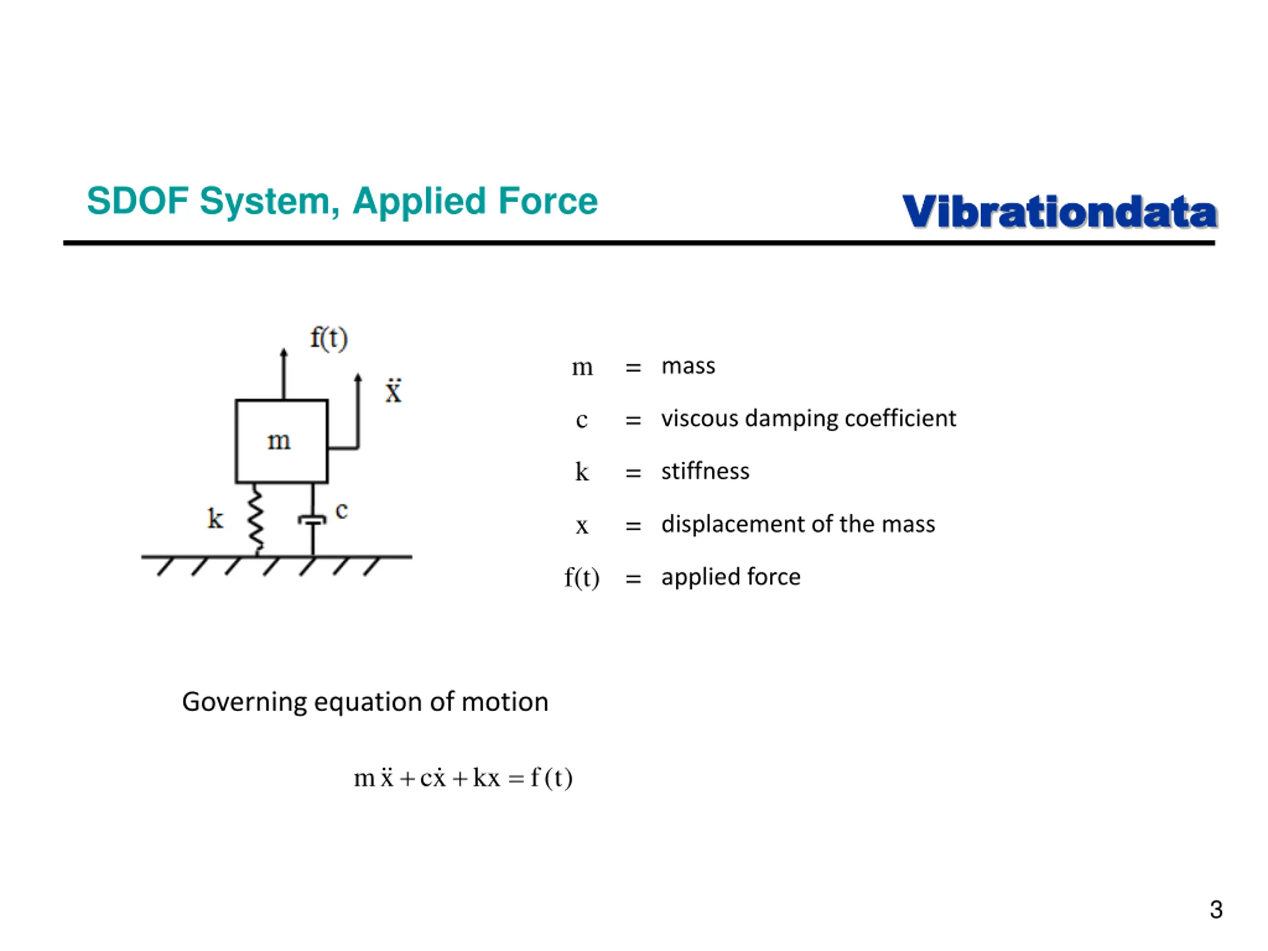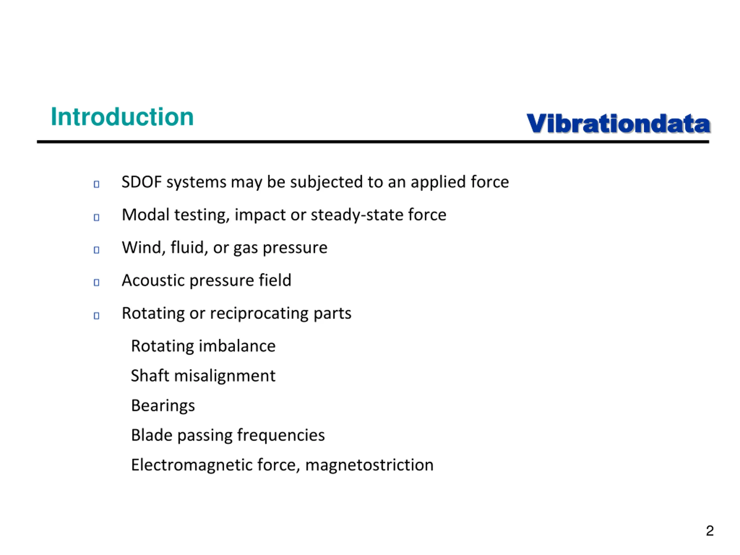 Introduction Vibrationdata Vibrationdata SDOF systems may be subjected to an applied force Modal testing, impact or steady-state force Wind, fluid, or gas pressure Acoustic pressure field Rotating or reciprocating parts Rotating imbalance Shaft misalignment Bearings Blade passing frequencies Electromagnetic force, magnetostriction 2