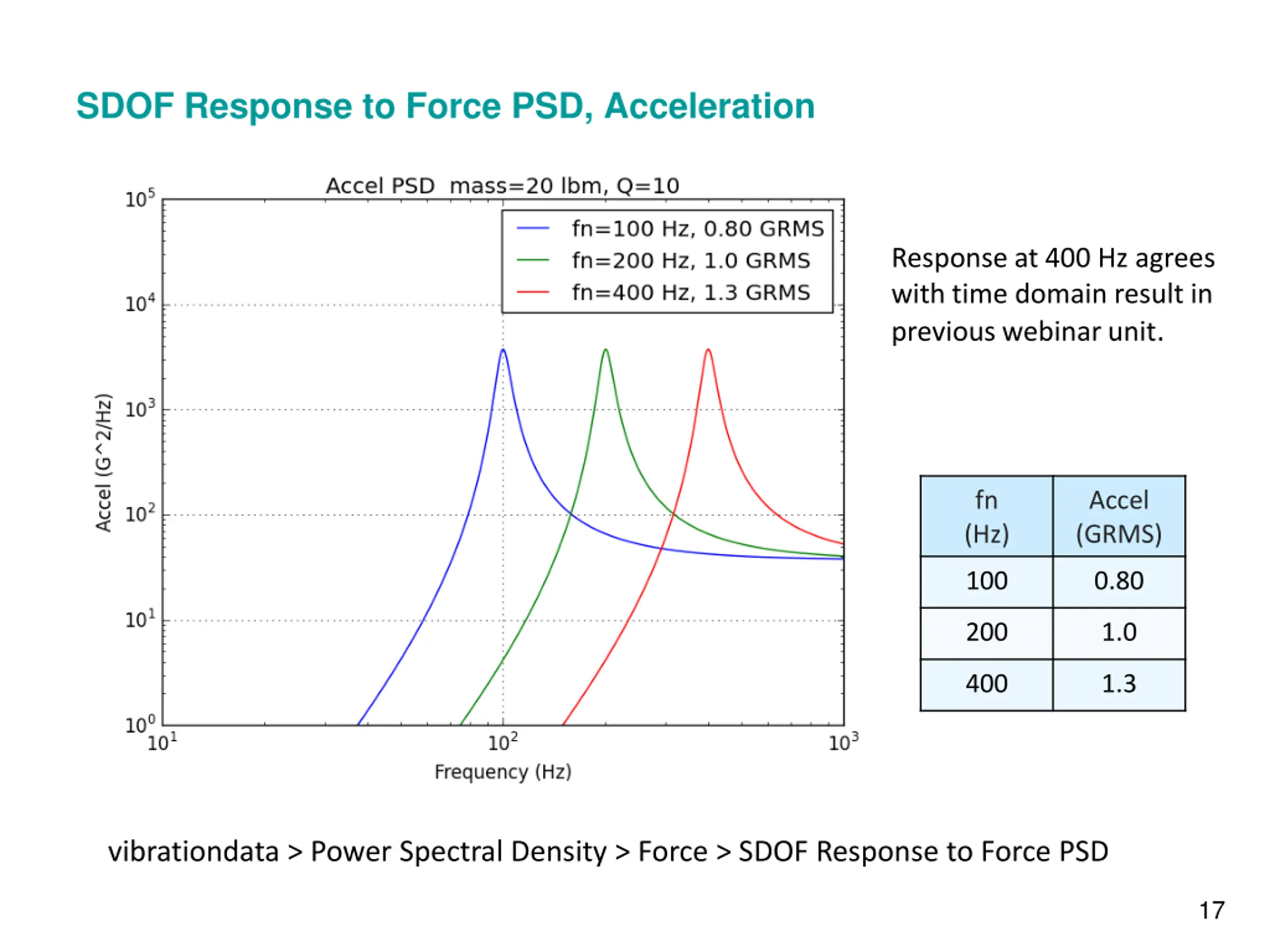 Vibrationdata Vibrationdata SDOF Example Apply the Force PSD on the previous slide to the SDOF system. Duration = 60 seconds (but only affects peak value) Mass = 20 lbm, Q=10, Natural Frequency = independent variable 16