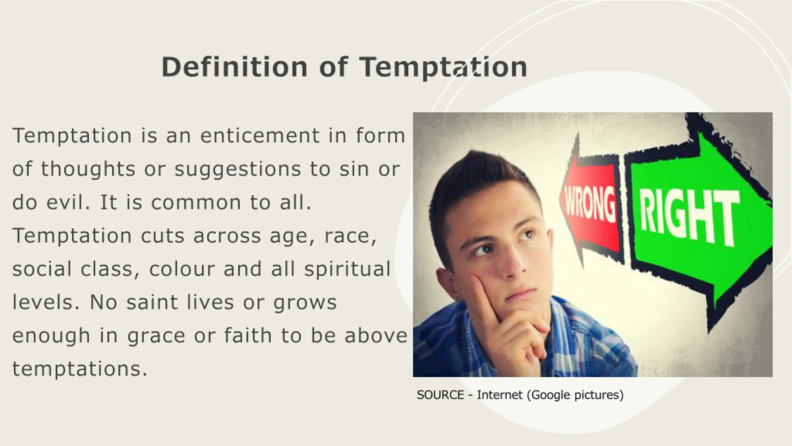Definition of Temptation Temptation is an enticement in form of thoughts or suggestions to sin or do evil. It is common to all. Temptation cuts across age, race, social class, colour and all spiritual levels. No saint lives or grows enough in grace or faith to be above temptations. JJJJJJJJ SOURCE - Internet (Google pictures)