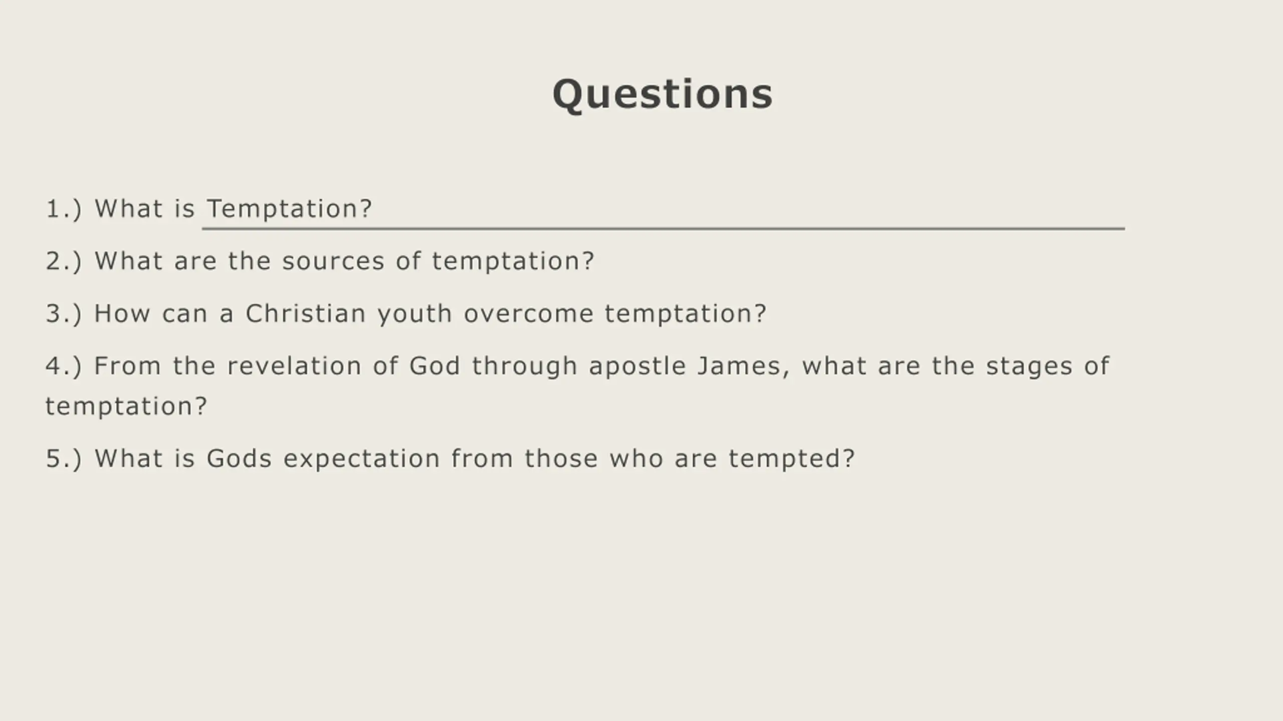 Questions 1.) What is Temptation? 2.) What are the sources of temptation? 3.) How can a Christian youth overcome temptation? 4.) From the revelation of God through apostle James, what are the stages of temptation? 5.) What is Gods expectation from those who are tempted?