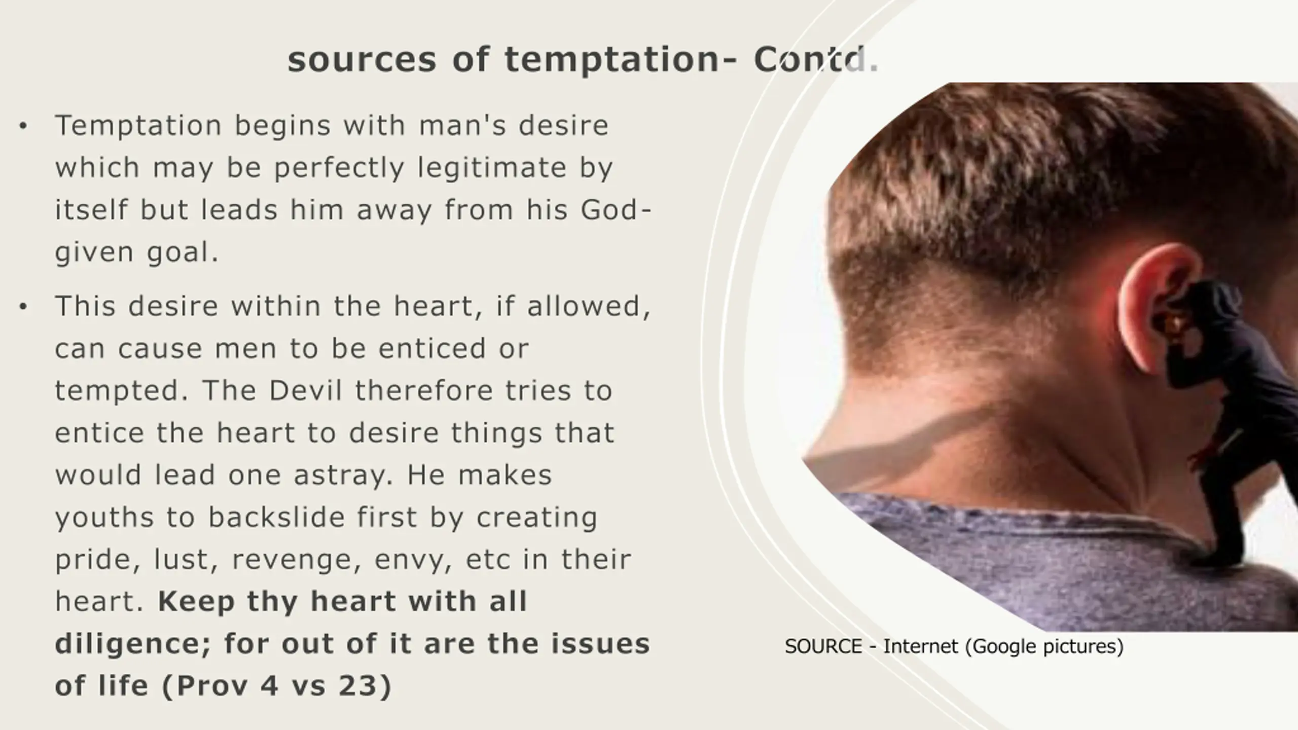 sources of temptation- Contd. Temptation begins with man's desire which may be perfectly legitimate by itself but leads him away from his God- given goal. This desire within the heart, if allowed, can cause men to be enticed or tempted. The Devil therefore tries to entice the heart to desire things that would lead one astray. He makes youths to backslide first by creating pride, lust, revenge, envy, etc in their heart. Keep thy heart with all diligence; for out of it are the issues of life (Prov 4 vs 23) C SOURCE - Internet (Google pictures)