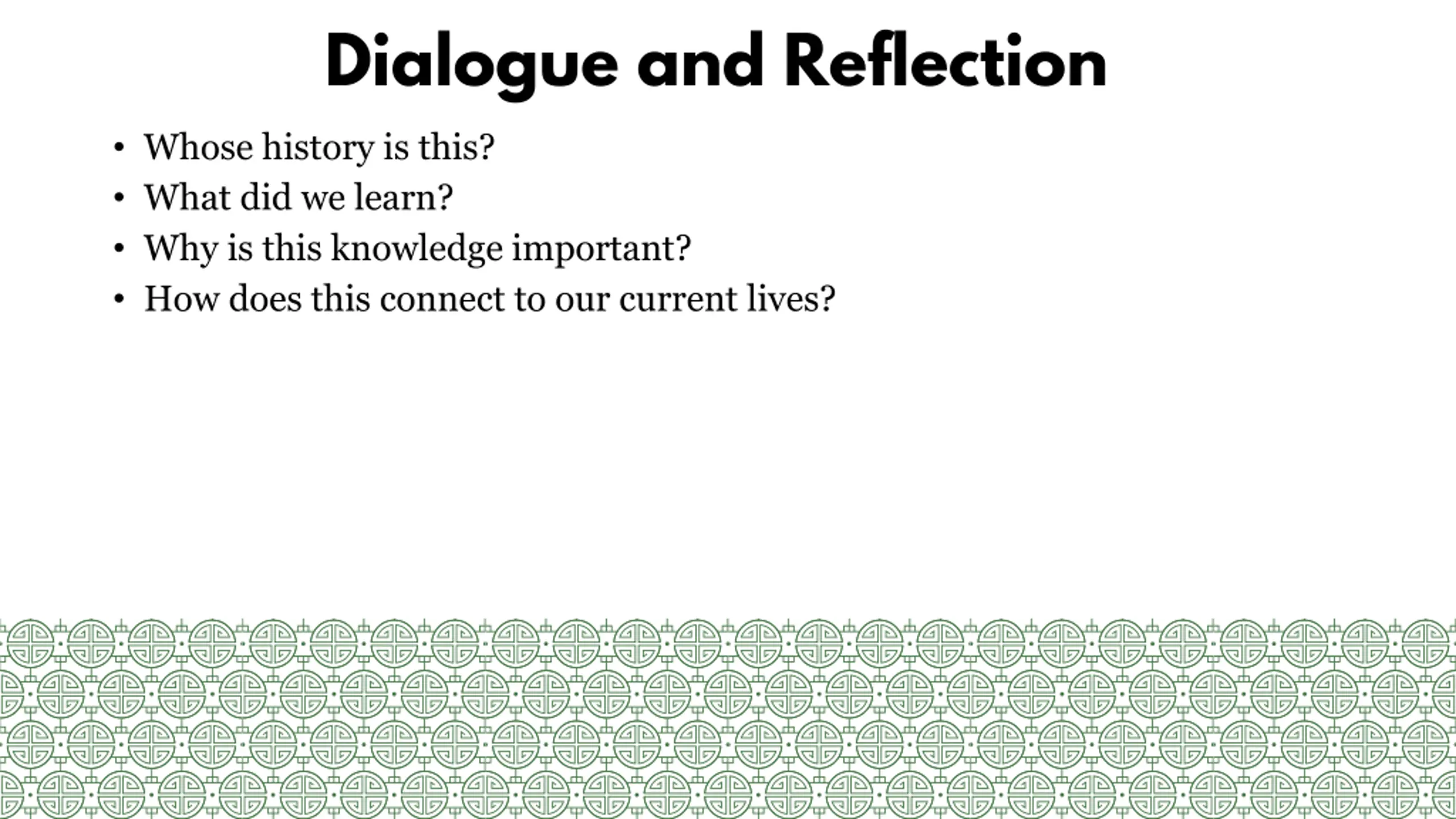 Dialogue and Reflection Whose history is this? What did we learn? Why is this knowledge important? How does this connect to our current lives?
