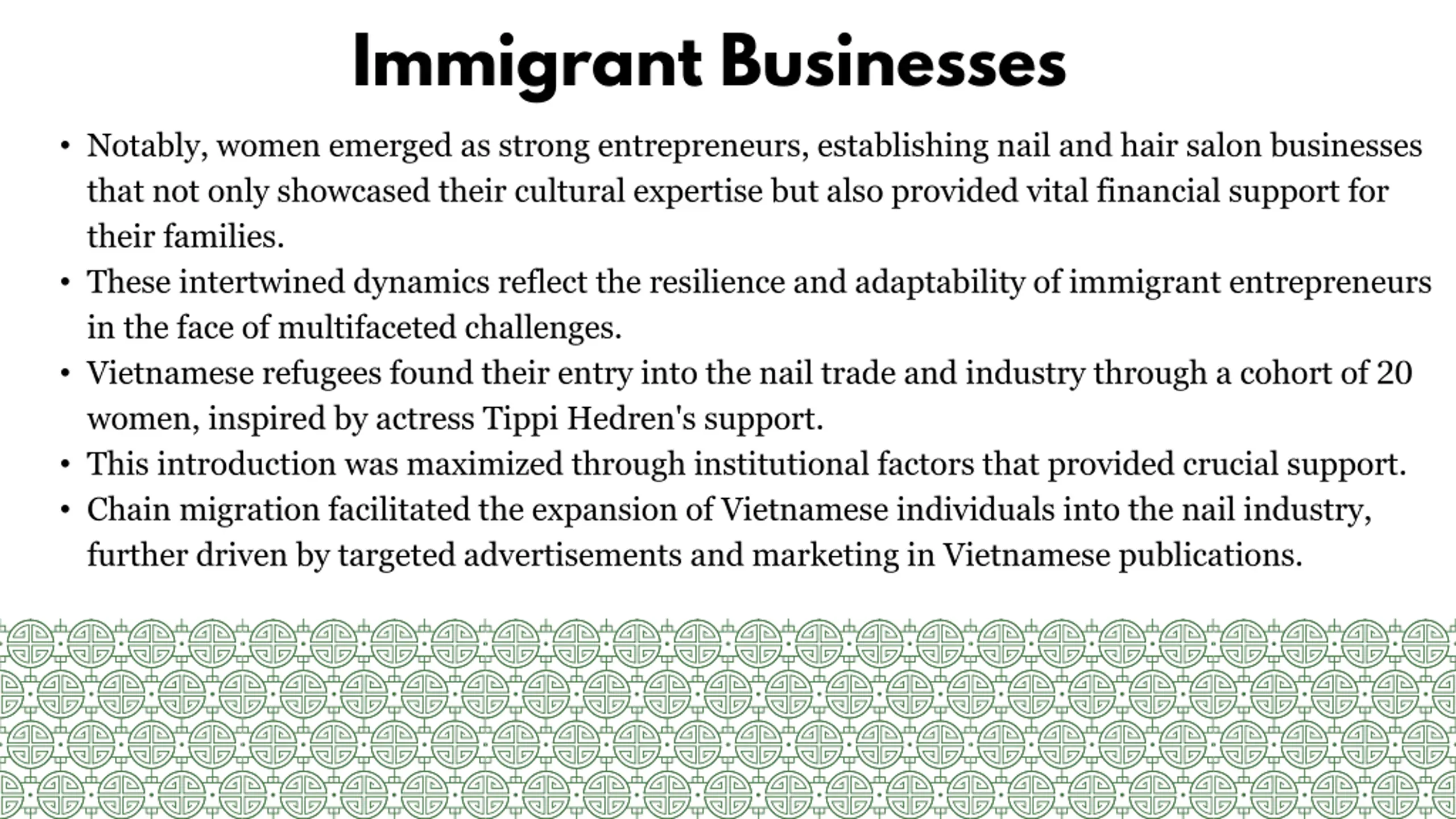 Immigrant Businesses Notably, women emerged as strong entrepreneurs, establishing nail and hair salon businesses that not only showcased their cultural expertise but also provided vital financial support for their families. These intertwined dynamics reflect the resilience and adaptability of immigrant entrepreneurs in the face of multifaceted challenges. Vietnamese refugees found their entry into the nail trade and industry through a cohort of 20 women, inspired by actress Tippi Hedren's support. This introduction was maximized through institutional factors that provided crucial support. Chain migration facilitated the expansion of Vietnamese individuals into the nail industry, further driven by targeted advertisements and marketing in Vietnamese publications.