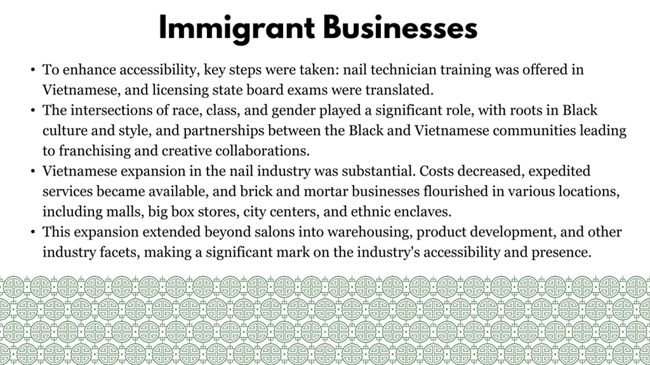 Immigrant Businesses To enhance accessibility, key steps were taken: nail technician training was offered in Vietnamese, and licensing state board exams were translated. The intersections of race, class, and gender played a significant role, with roots in Black culture and style, and partnerships between the Black and Vietnamese communities leading to franchising and creative collaborations. Vietnamese expansion in the nail industry was substantial. Costs decreased, expedited services became available, and brick and mortar businesses flourished in various locations, including malls, big box stores, city centers, and ethnic enclaves. This expansion extended beyond salons into warehousing, product development, and other industry facets, making a significant mark on the industry's accessibility and presence.