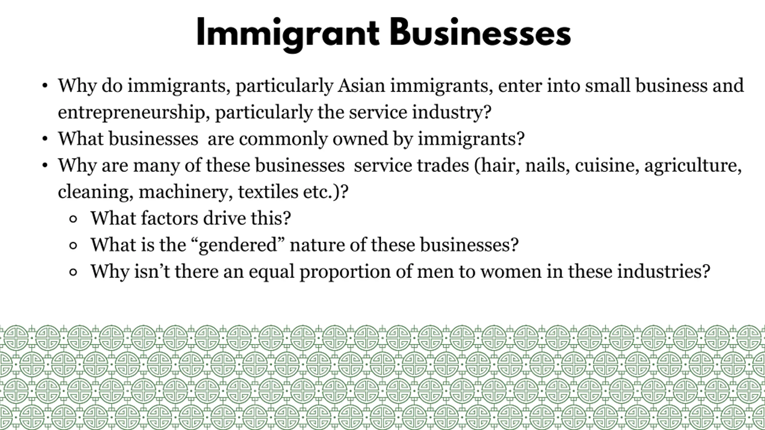 Immigrant Businesses Why do immigrants, particularly Asian immigrants, enter into small business and entrepreneurship, particularly the service industry? What businesses are commonly owned by immigrants? Why are many of these businesses service trades (hair, nails, cuisine, agriculture, cleaning, machinery, textiles etc.)? What factors drive this? What is the gendered nature of these businesses? Why isn t there an equal proportion of men to women in these industries?