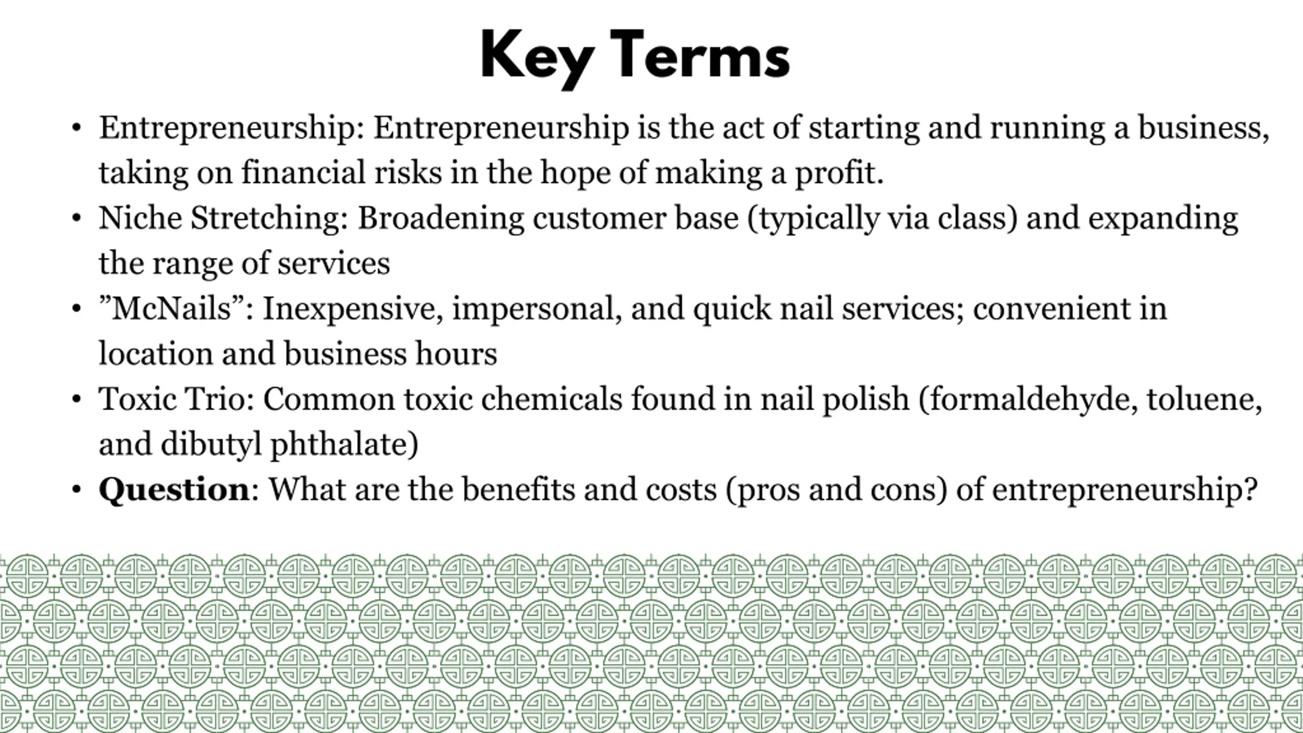 Key Terms Entrepreneurship: Entrepreneurship is the act of starting and running a business, taking on financial risks in the hope of making a profit. Niche Stretching: Broadening customer base (typically via class) and expanding the range of services McNails : Inexpensive, impersonal, and quick nail services; convenient in location and business hours Toxic Trio: Common toxic chemicals found in nail polish (formaldehyde, toluene, and dibutyl phthalate) Question: What are the benefits and costs (pros and cons) of entrepreneurship?