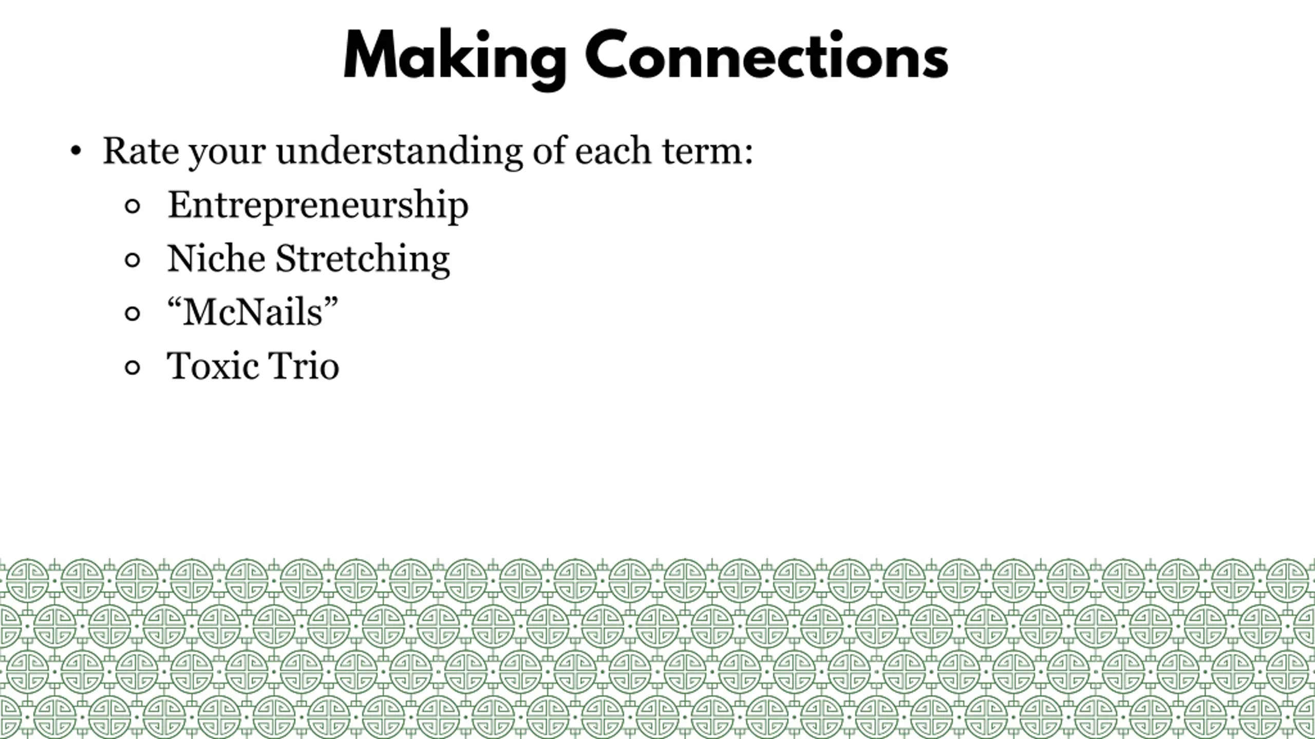 Making Connections Rate your understanding of each term: Entrepreneurship Niche Stretching McNails Toxic Trio