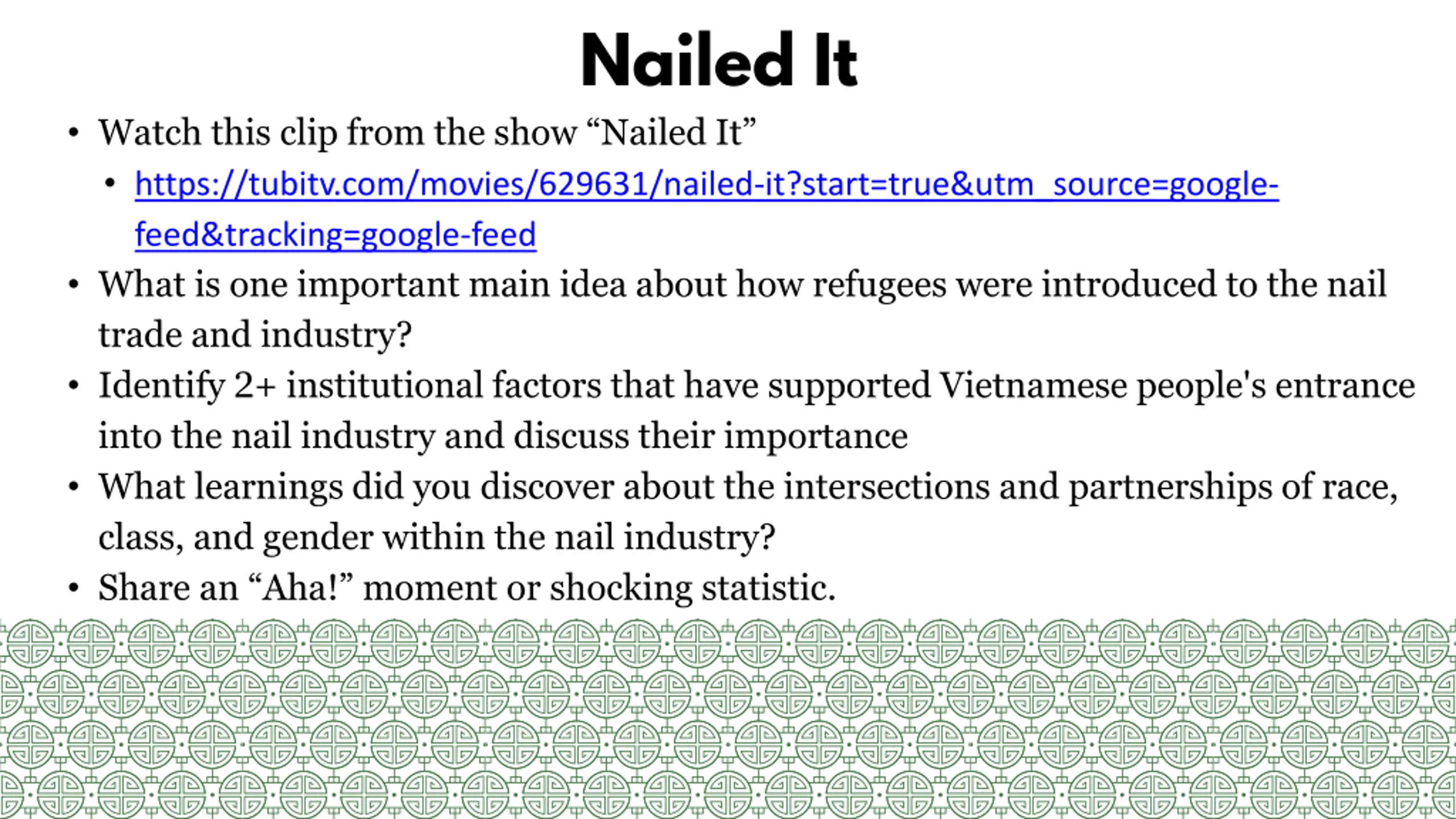 Nailed It Watch this clip from the show Nailed It https://tubitv.com/movies/629631/nailed-it?start=true&utm_source=google- feed&tracking=google-feed What is one important main idea about how refugees were introduced to the nail trade and industry? Identify 2+ institutional factors that have supported Vietnamese people's entrance into the nail industry and discuss their importance What learnings did you discover about the intersections and partnerships of race, class, and gender within the nail industry? Share an Aha! moment or shocking statistic.