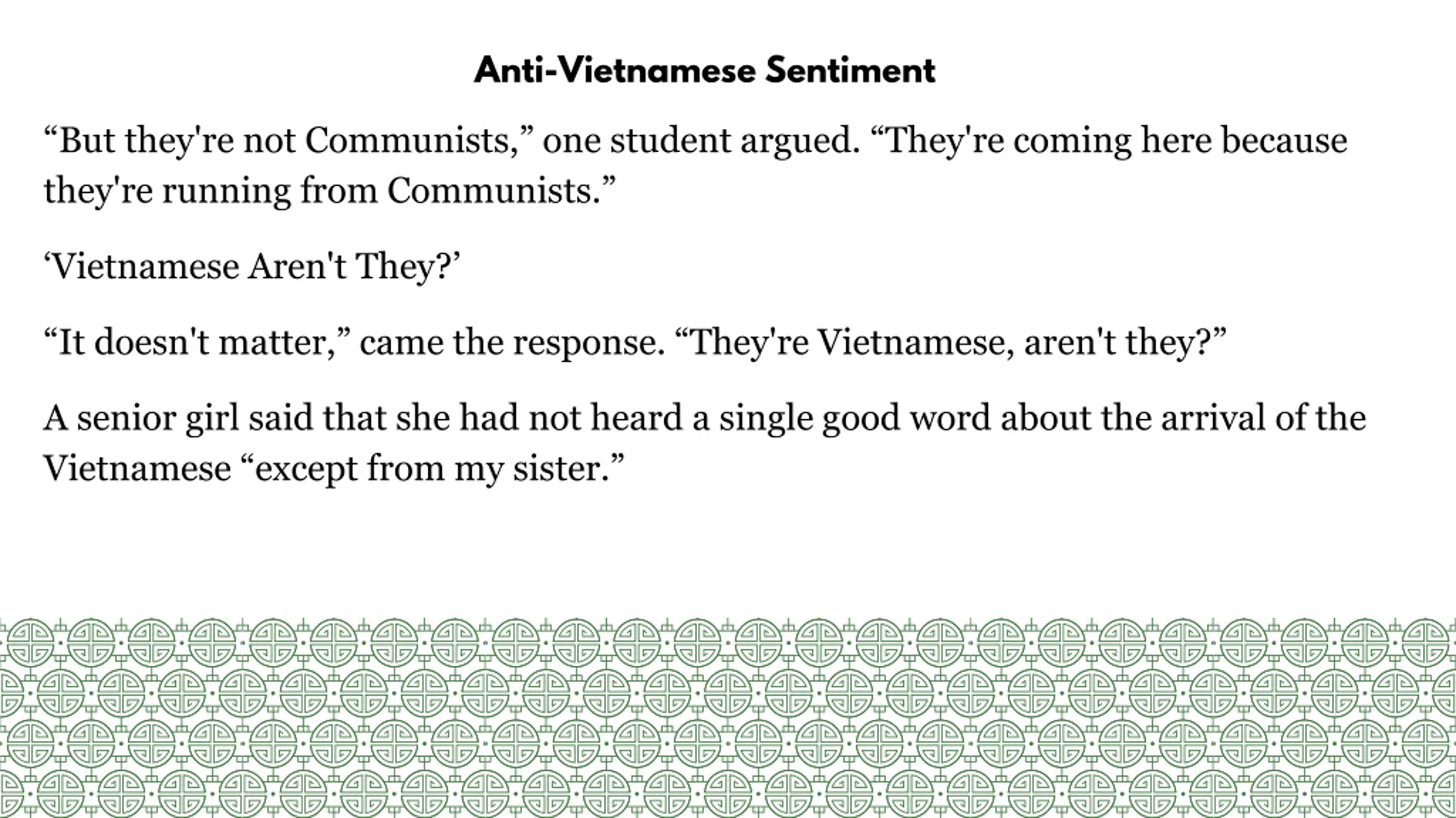 Anti-Vietnamese Sentiment But they're not Communists, one student argued. They're coming here because they're running from Communists. Vietnamese Aren't They? It doesn't matter, came the response. They're Vietnamese, aren't they? A senior girl said that she had not heard a single good word about the arrival of the Vietnamese except from my sister.