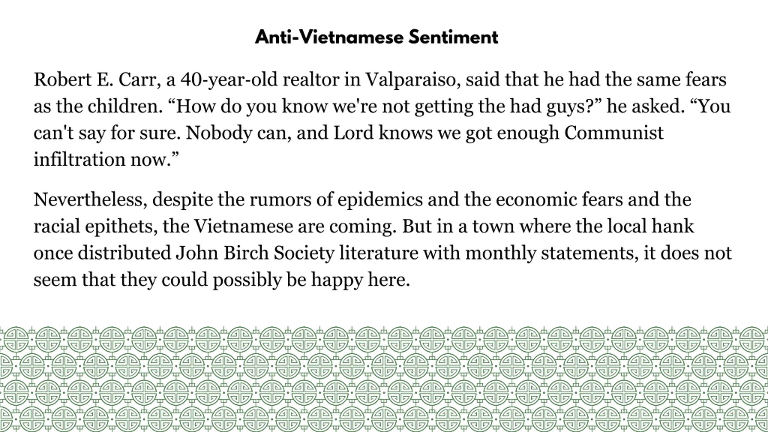 Anti-Vietnamese Sentiment Robert E. Carr, a 40 year old realtor in Valparaiso, said that he had the same fears as the children. How do you know we're not getting the had guys? he asked. You can't say for sure. Nobody can, and Lord knows we got enough Communist infiltration now. Nevertheless, despite the rumors of epidemics and the economic fears and the racial epithets, the Vietnamese are coming. But in a town where the local hank once distributed John Birch Society literature with monthly statements, it does not seem that they could possibly be happy here.