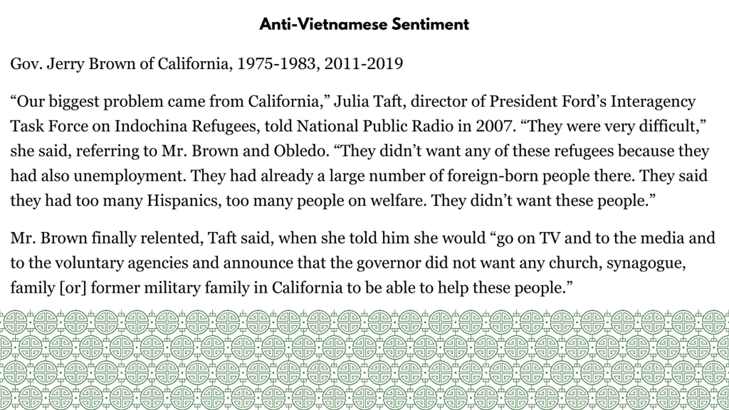 Anti-Vietnamese Sentiment Gov. Jerry Brown of California, 1975-1983, 2011-2019 Our biggest problem came from California, Julia Taft, director of President Ford s Interagency Task Force on Indochina Refugees, told National Public Radio in 2007. They were very difficult, she said, referring to Mr. Brown and Obledo. They didn t want any of these refugees because they had also unemployment. They had already a large number of foreign-born people there. They said they had too many Hispanics, too many people on welfare. They didn t want these people. Mr. Brown finally relented, Taft said, when she told him she would go on TV and to the media and to the voluntary agencies and announce that the governor did not want any church, synagogue, family [or] former military family in California to be able to help these people.