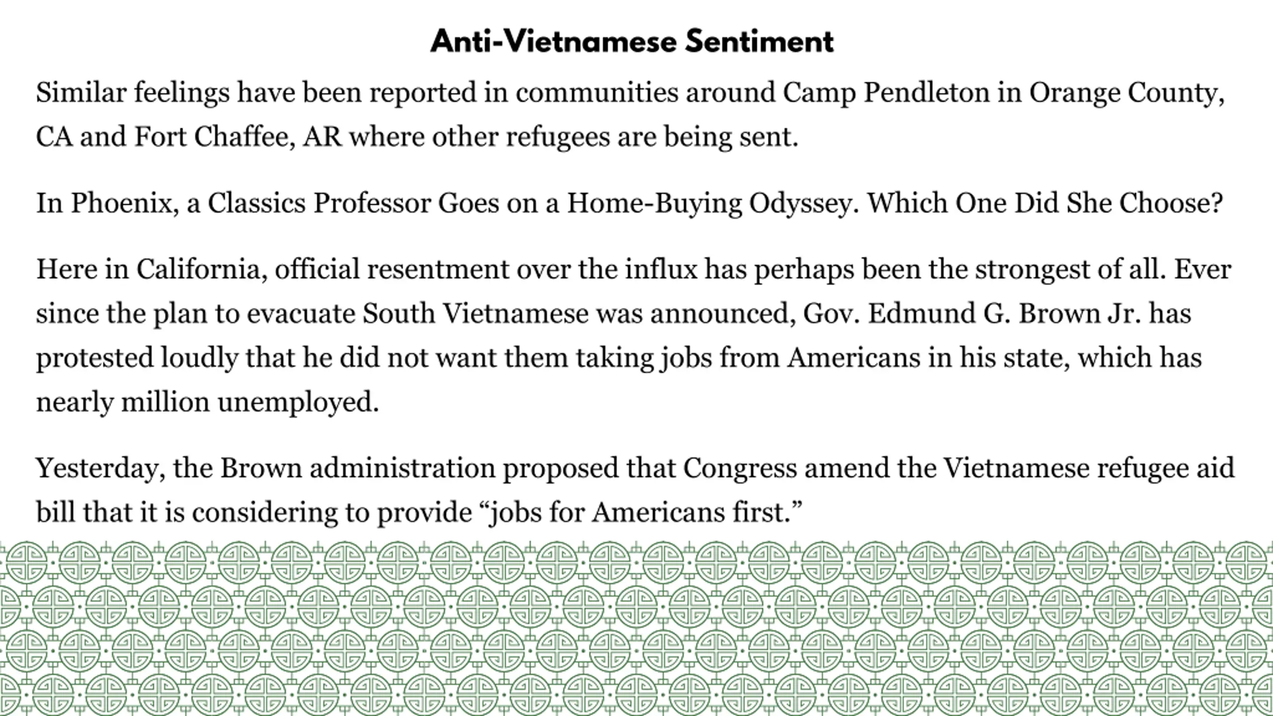 Anti-Vietnamese Sentiment Similar feelings have been reported in communities around Camp Pendleton in Orange County, CA and Fort Chaffee, AR where other refugees are being sent. In Phoenix, a Classics Professor Goes on a Home-Buying Odyssey. Which One Did She Choose? Here in California, official resentment over the influx has perhaps been the strongest of all. Ever since the plan to evacuate South Vietnamese was announced, Gov. Edmund G. Brown Jr. has protested loudly that he did not want them taking jobs from Americans in his state, which has nearly million unemployed. Yesterday, the Brown administration proposed that Congress amend the Vietnamese refugee aid bill that it is considering to provide jobs for Americans first.