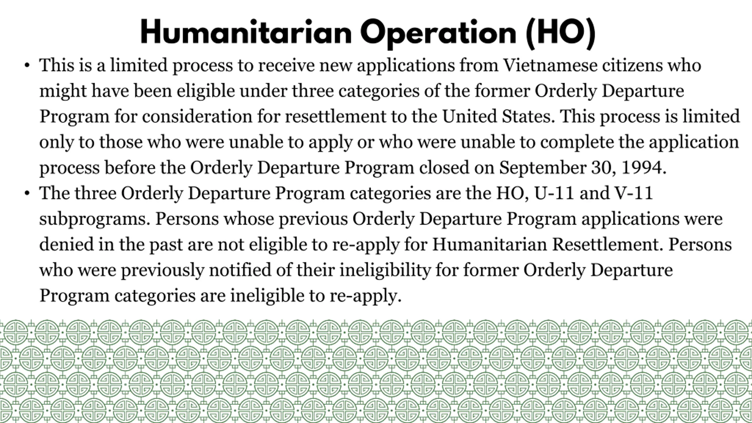 Humanitarian Operation (HO) This is a limited process to receive new applications from Vietnamese citizens who might have been eligible under three categories of the former Orderly Departure Program for consideration for resettlement to the United States. This process is limited only to those who were unable to apply or who were unable to complete the application process before the Orderly Departure Program closed on September 30, 1994. The three Orderly Departure Program categories are the HO, U-11 and V-11 subprograms. Persons whose previous Orderly Departure Program applications were denied in the past are not eligible to re-apply for Humanitarian Resettlement. Persons who were previously notified of their ineligibility for former Orderly Departure Program categories are ineligible to re-apply.