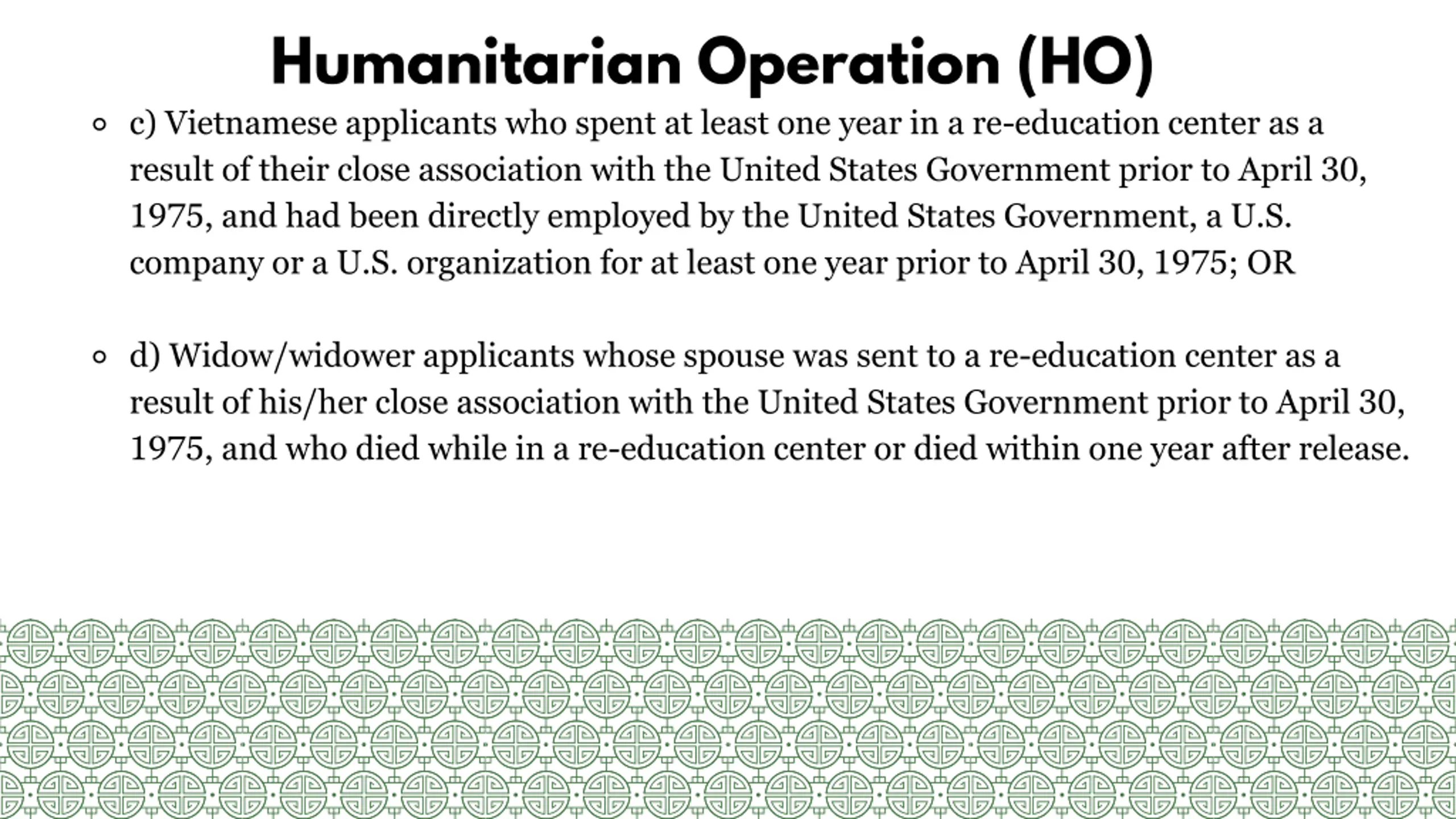Humanitarian Operation (HO) c) Vietnamese applicants who spent at least one year in a re-education center as a result of their close association with the United States Government prior to April 30, 1975, and had been directly employed by the United States Government, a U.S. company or a U.S. organization for at least one year prior to April 30, 1975; OR d) Widow/widower applicants whose spouse was sent to a re-education center as a result of his/her close association with the United States Government prior to April 30, 1975, and who died while in a re-education center or died within one year after release.