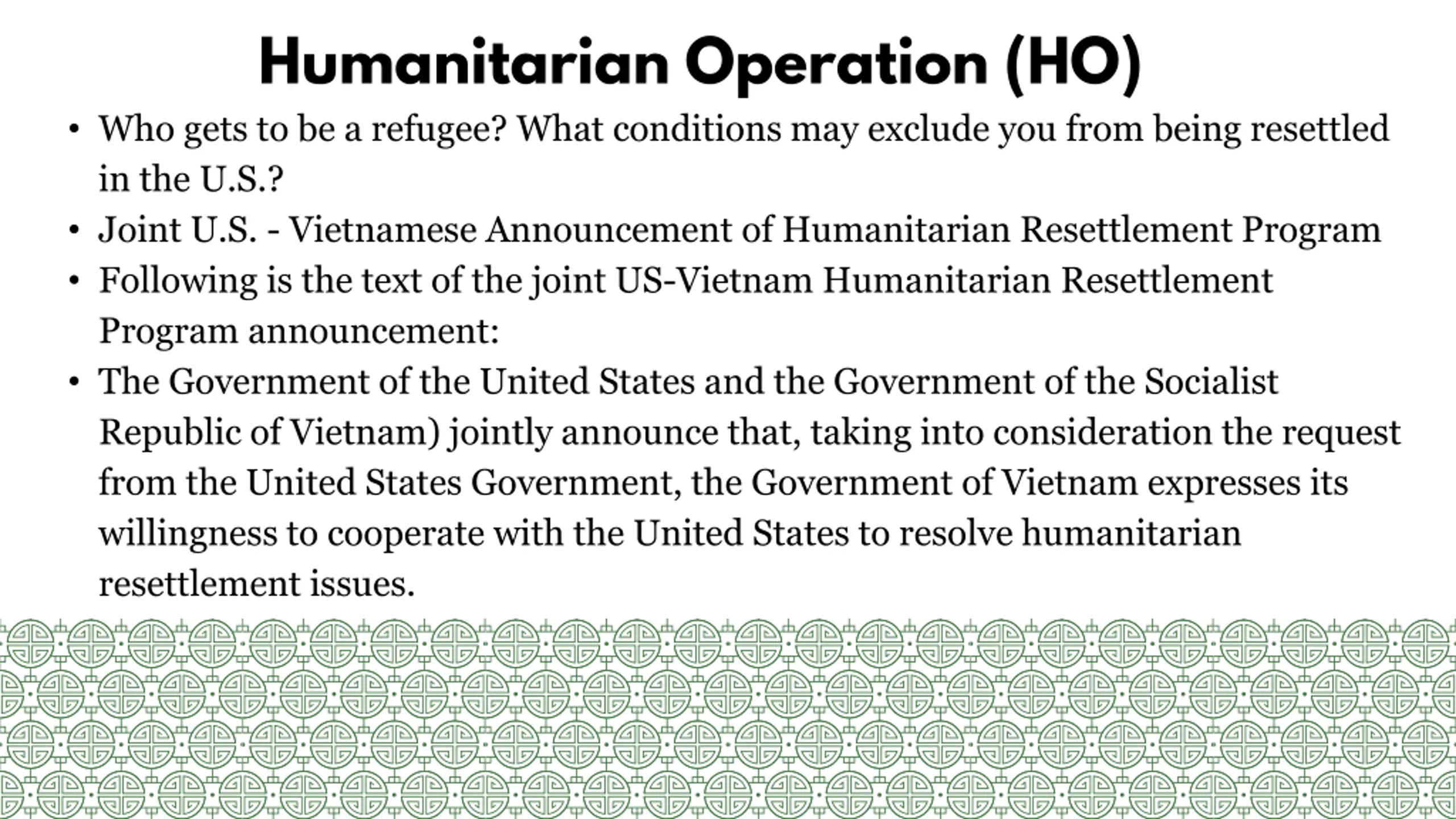 Humanitarian Operation (HO) Who gets to be a refugee? What conditions may exclude you from being resettled in the U.S.? Joint U.S. - Vietnamese Announcement of Humanitarian Resettlement Program Following is the text of the joint US-Vietnam Humanitarian Resettlement Program announcement: The Government of the United States and the Government of the Socialist Republic of Vietnam) jointly announce that, taking into consideration the request from the United States Government, the Government of Vietnam expresses its willingness to cooperate with the United States to resolve humanitarian resettlement issues.