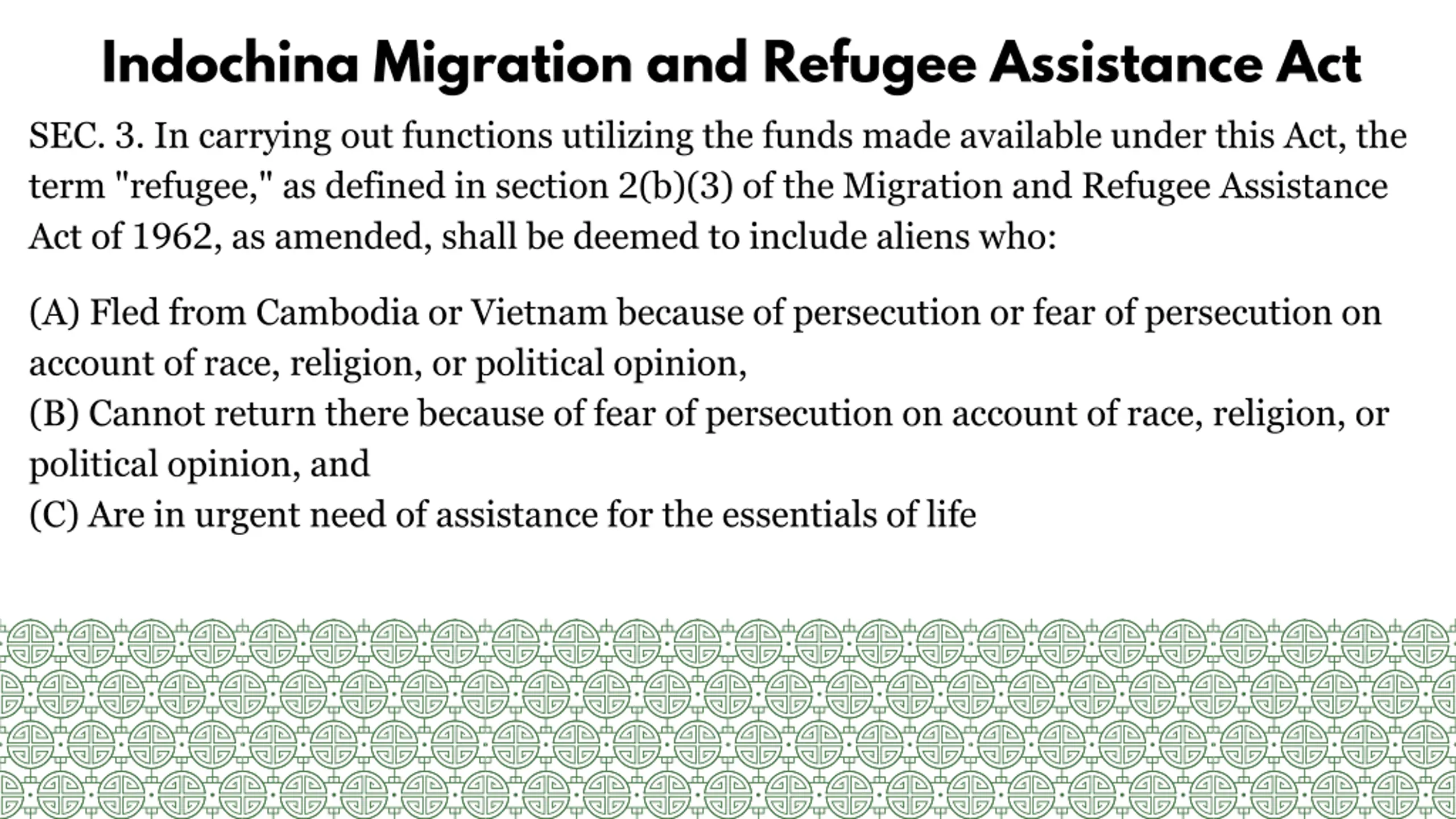 Refugee Act of 1980 Act created first legal definition of refugee based on UN Convention as separate from immigrant Refugees from 1975-1980 were treated as illegal migrants on parole due to Indochinese Refugee Act in 1975 Initial goal of repatriating all 125,000 refugees after spending time in camps 56% of Americans did not support admission of any Indochinese refugees (anti-Vietnamese sentiment) Refugee Act of 1980 only admitted those who could prove that they had a well-founded fear of persecution In reality, only those who could justify fleeing Vietnamese communism were admitted Those displaced by U.S. bombing in Vietnam, Laos, and Cambodia, including ethnic minorities who fought in a U.S.-backed Secret War in Laos, were not admitted