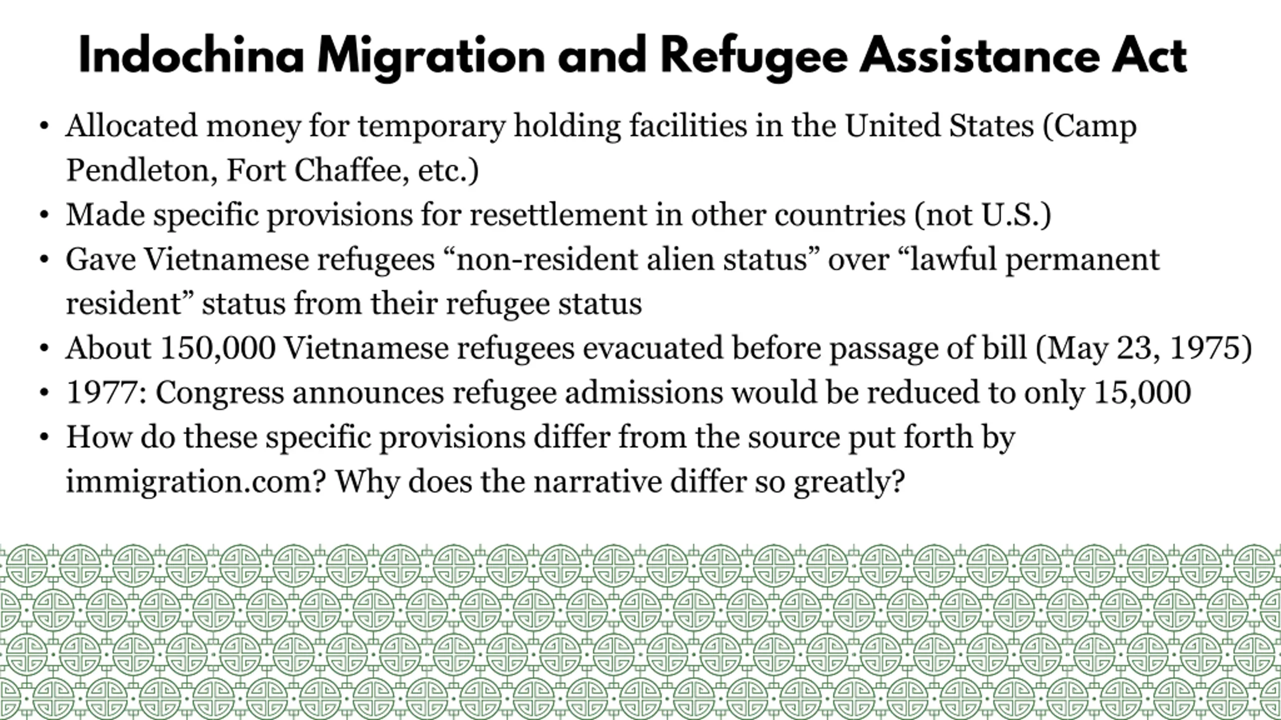 Indochina Migration and Refugee Assistance Act Allocated money for temporary holding facilities in the United States (Camp Pendleton, Fort Chaffee, etc.) Made specific provisions for resettlement in other countries (not U.S.) Gave Vietnamese refugees non-resident alien status over lawful permanent resident status from their refugee status About 150,000 Vietnamese refugees evacuated before passage of bill (May 23, 1975) 1977: Congress announces refugee admissions would be reduced to only 15,000 How do these specific provisions differ from the source put forth by immigration.com? Why does the narrative differ so greatly?
