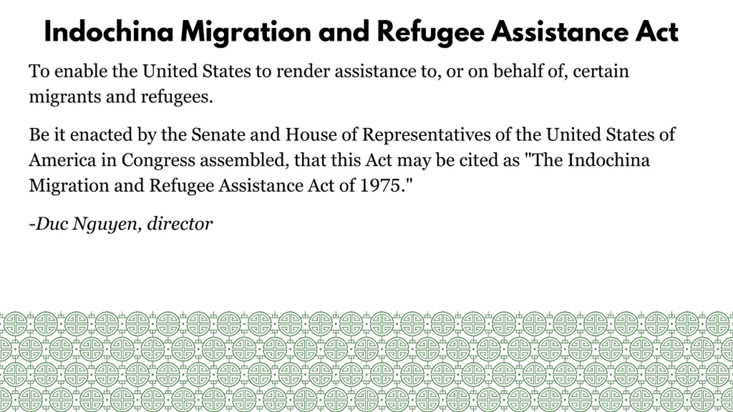 Indochina Migration and Refugee Assistance Act To enable the United States to render assistance to, or on behalf of, certain migrants and refugees. Be it enacted by the Senate and House of Representatives of the United States of America in Congress assembled, that this Act may be cited as "The Indochina Migration and Refugee Assistance Act of 1975." -Duc Nguyen, director