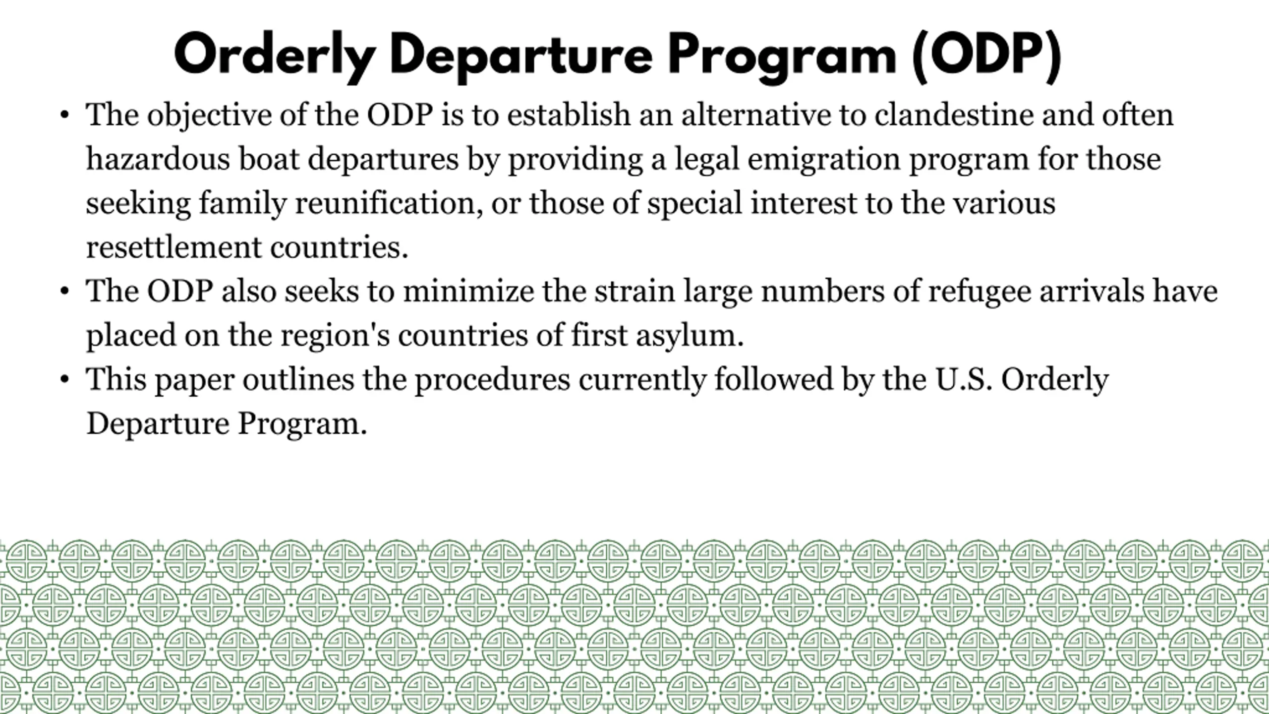 Orderly Departure Program (ODP) The objective of the ODP is to establish an alternative to clandestine and often hazardous boat departures by providing a legal emigration program for those seeking family reunification, or those of special interest to the various resettlement countries. The ODP also seeks to minimize the strain large numbers of refugee arrivals have placed on the region's countries of first asylum. This paper outlines the procedures currently followed by the U.S. Orderly Departure Program.