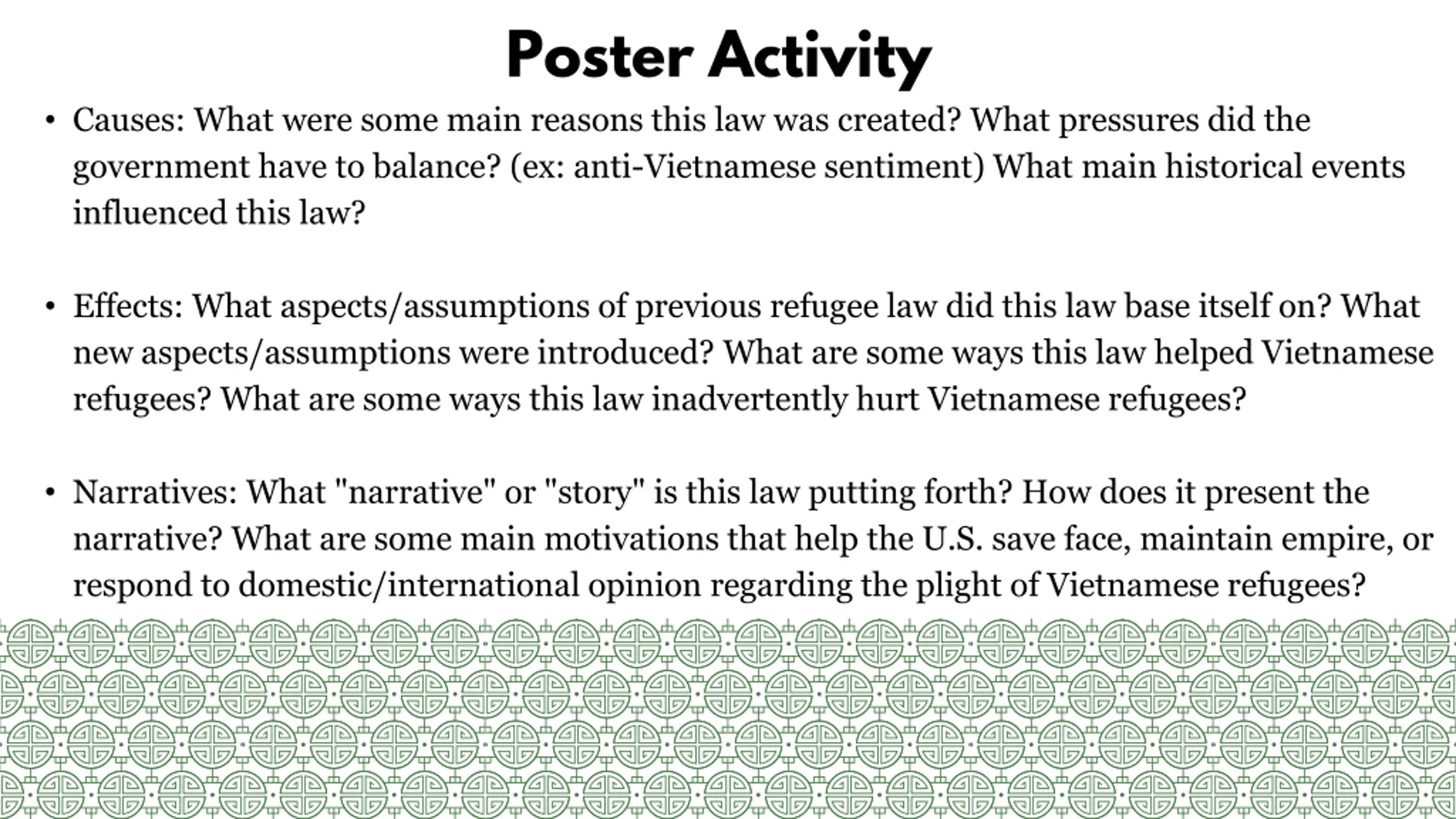 Poster Activity Causes: What were some main reasons this law was created? What pressures did the government have to balance? (ex: anti-Vietnamese sentiment) What main historical events influenced this law? Effects: What aspects/assumptions of previous refugee law did this law base itself on? What new aspects/assumptions were introduced? What are some ways this law helped Vietnamese refugees? What are some ways this law inadvertently hurt Vietnamese refugees? Narratives: What "narrative" or "story" is this law putting forth? How does it present the narrative? What are some main motivations that help the U.S. save face, maintain empire, or respond to domestic/international opinion regarding the plight of Vietnamese refugees?