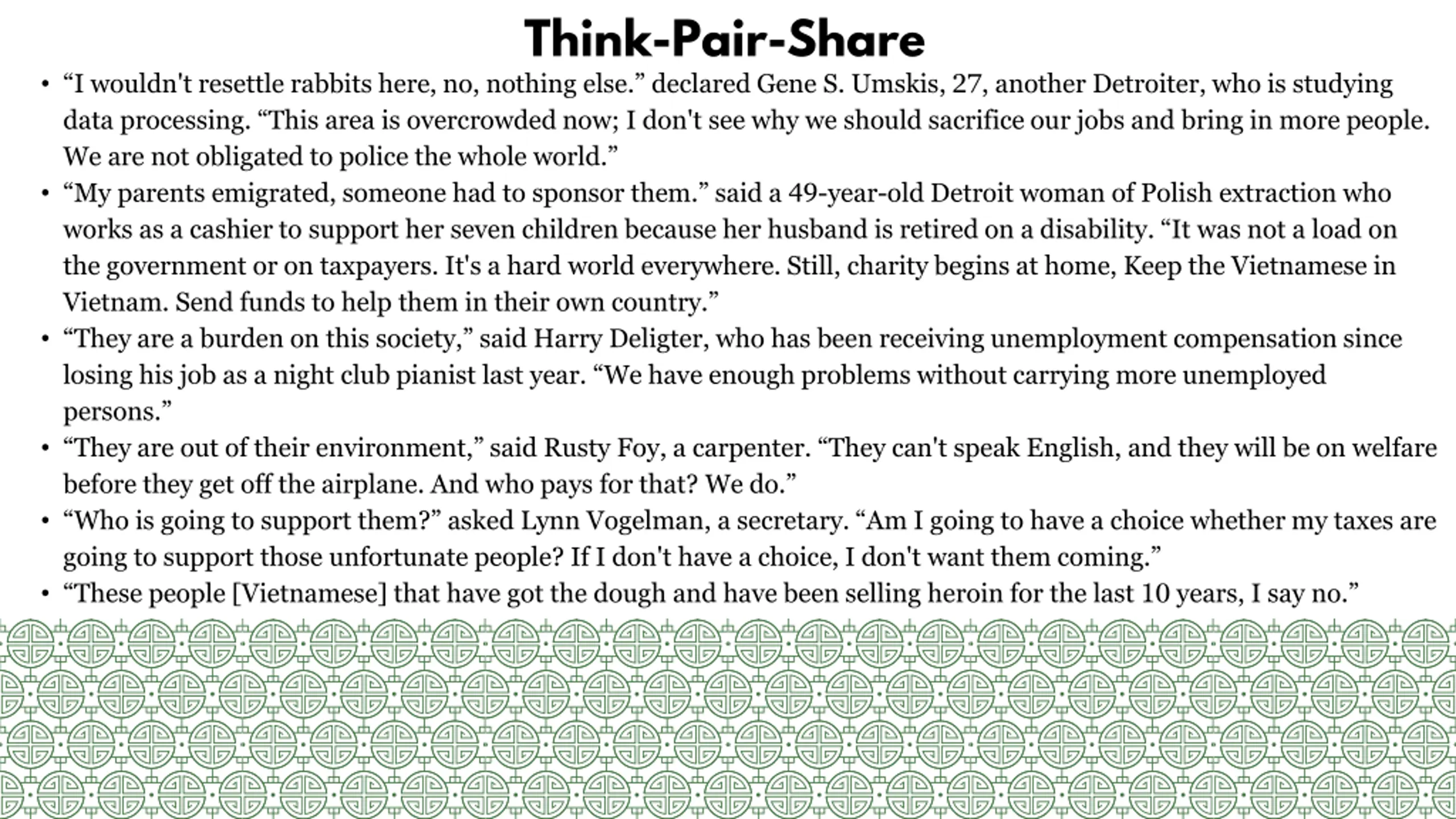 Think-Pair-Share I wouldn't resettle rabbits here, no, nothing else. declared Gene S. Umskis, 27, another Detroiter, who is studying data processing. This area is overcrowded now; I don't see why we should sacrifice our jobs and bring in more people. We are not obligated to police the whole world. My parents emigrated, someone had to sponsor them. said a 49-year-old Detroit woman of Polish extraction who works as a cashier to support her seven children because her husband is retired on a disability. It was not a load on the government or on taxpayers. It's a hard world everywhere. Still, charity begins at home, Keep the Vietnamese in Vietnam. Send funds to help them in their own country. They are a burden on this society, said Harry Deligter, who has been receiving unemployment compensation since losing his job as a night club pianist last year. We have enough problems without carrying more unemployed persons. They are out of their environment, said Rusty Foy, a carpenter. They can't speak English, and they will be on welfare before they get off the airplane. And who pays for that? We do. Who is going to support them? asked Lynn Vogelman, a secretary. Am I going to have a choice whether my taxes are going to support those unfortunate people? If I don't have a choice, I don't want them coming. These people [Vietnamese] that have got the dough and have been selling heroin for the last 10 years, I say no.