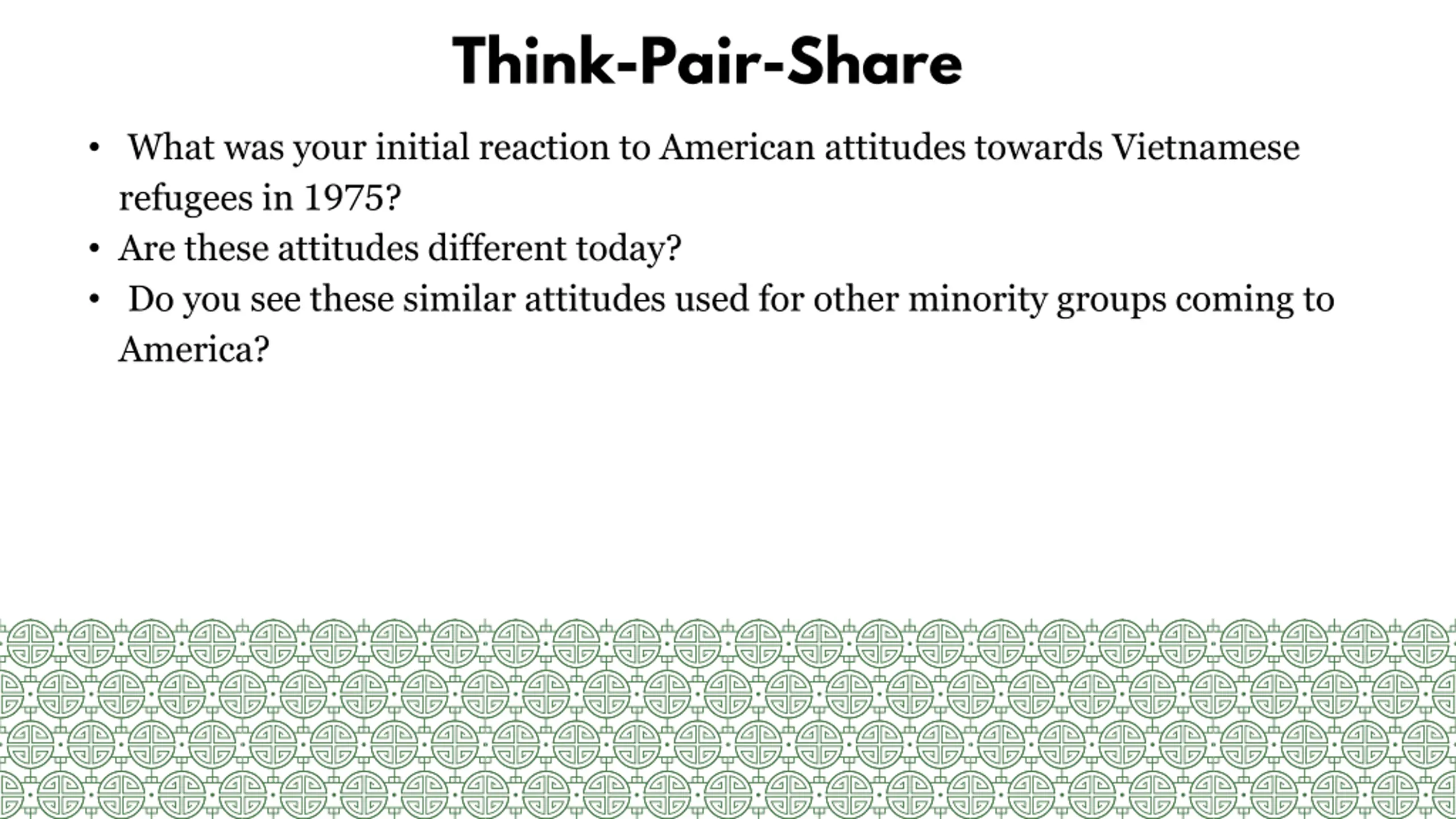 Think-Pair-Share What was your initial reaction to American attitudes towards Vietnamese refugees in 1975? Are these attitudes different today? Do you see these similar attitudes used for other minority groups coming to America?