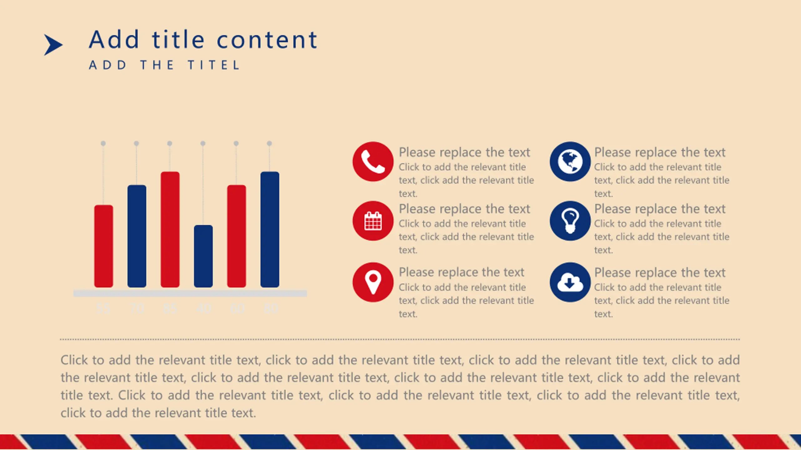 Add title content A D D T H E T I T E L Please replace the text Click to add the relevant title text, click add the relevant title text. Please replace the text Click to add the relevant title text, click add the relevant title text. Please replace the text Click to add the relevant title text, click add the relevant title text. Please replace the text Click to add the relevant title text, click add the relevant title text. Please replace the text Click to add the relevant title text, click add the relevant title text. Please replace the text Click to add the relevant title text, click add the relevant title text. 55 70 85 40 60 80 Click to add the relevant title text, click to add the relevant title text, click to add the relevant title text, click to add the relevant title text, click to add the relevant title text, click to add the relevant title text, click to add the relevant title text. Click to add the relevant title text, click to add the relevant title text, click to add the relevant title text, click to add the relevant title text.