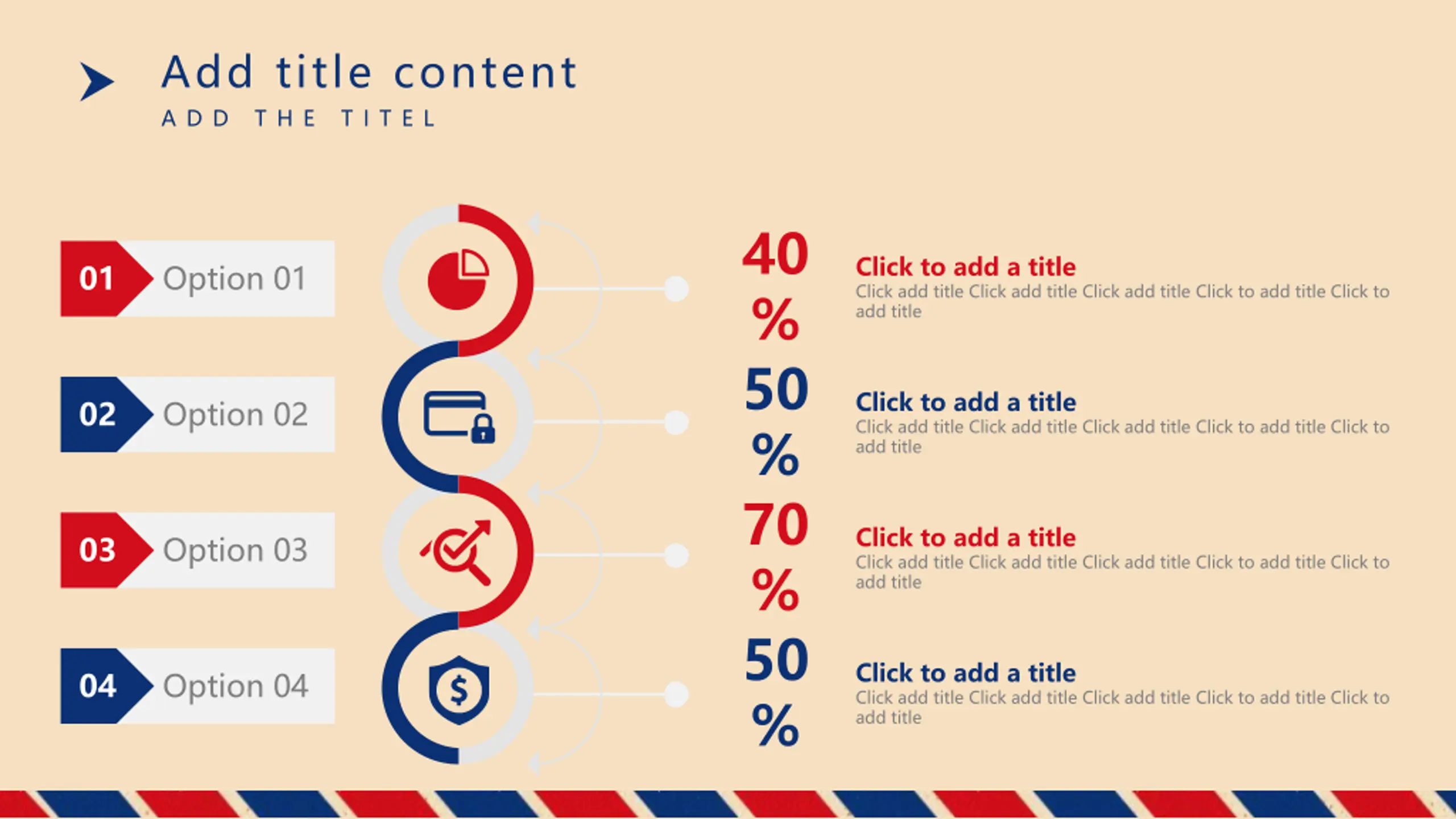 Add title content A D D T H E T I T E L 40 % 50 % 70 % 50 % Click to add a title Click add title Click add title Click add title Click to add title Click to add title 01 Option 01 Click to add a title Click add title Click add title Click add title Click to add title Click to add title 02 Option 02 Click to add a title Click add title Click add title Click add title Click to add title Click to add title 03 Option 03 Click to add a title Click add title Click add title Click add title Click to add title Click to add title 04 Option 04