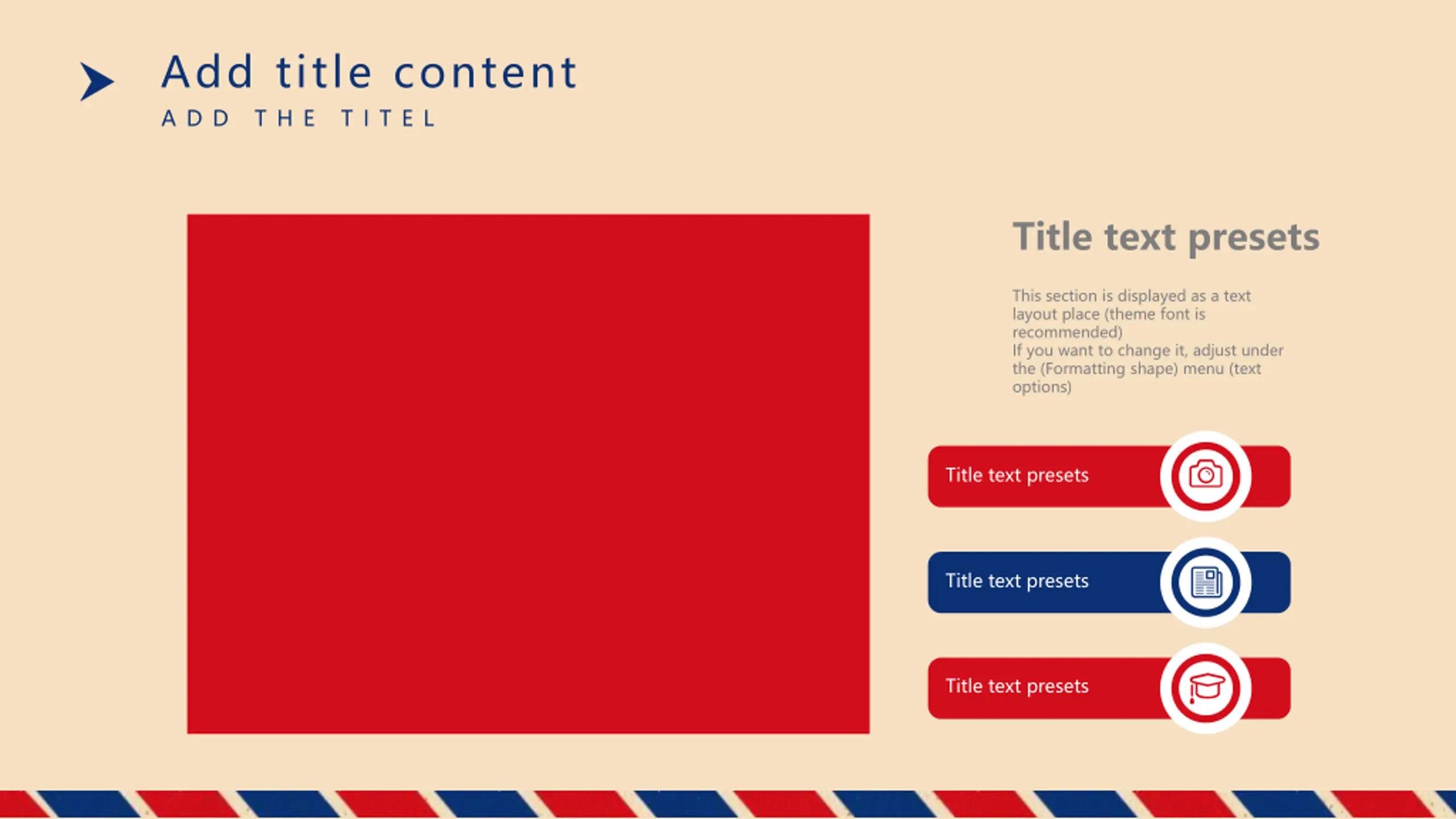 Add title content A D D T H E T I T E L Title text presets This section is displayed as a text layout place (theme font is recommended) If you want to change it, adjust under the (Formatting shape) menu (text options) Title text presets Title text presets Title text presets