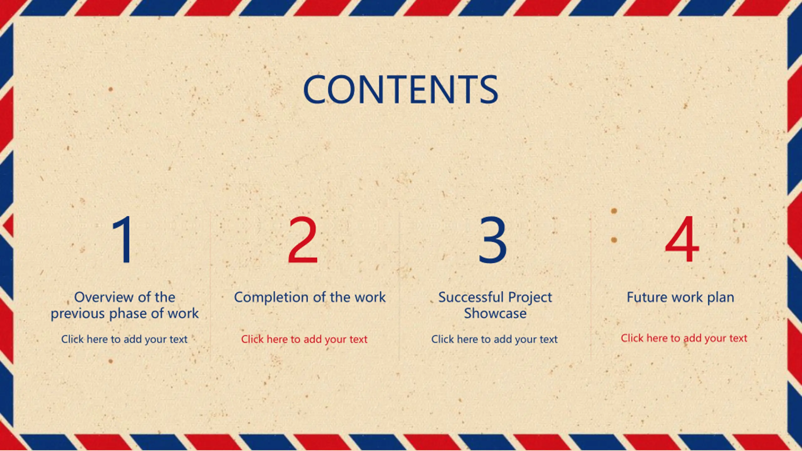 Explore the Vintage English Wind PowerPoint template for a timeless and elegant presentation design. This template includes sections for an overview of previous work phases, project completion, successful showcases, and future work plans. Easily insert your content with placeholders provided.