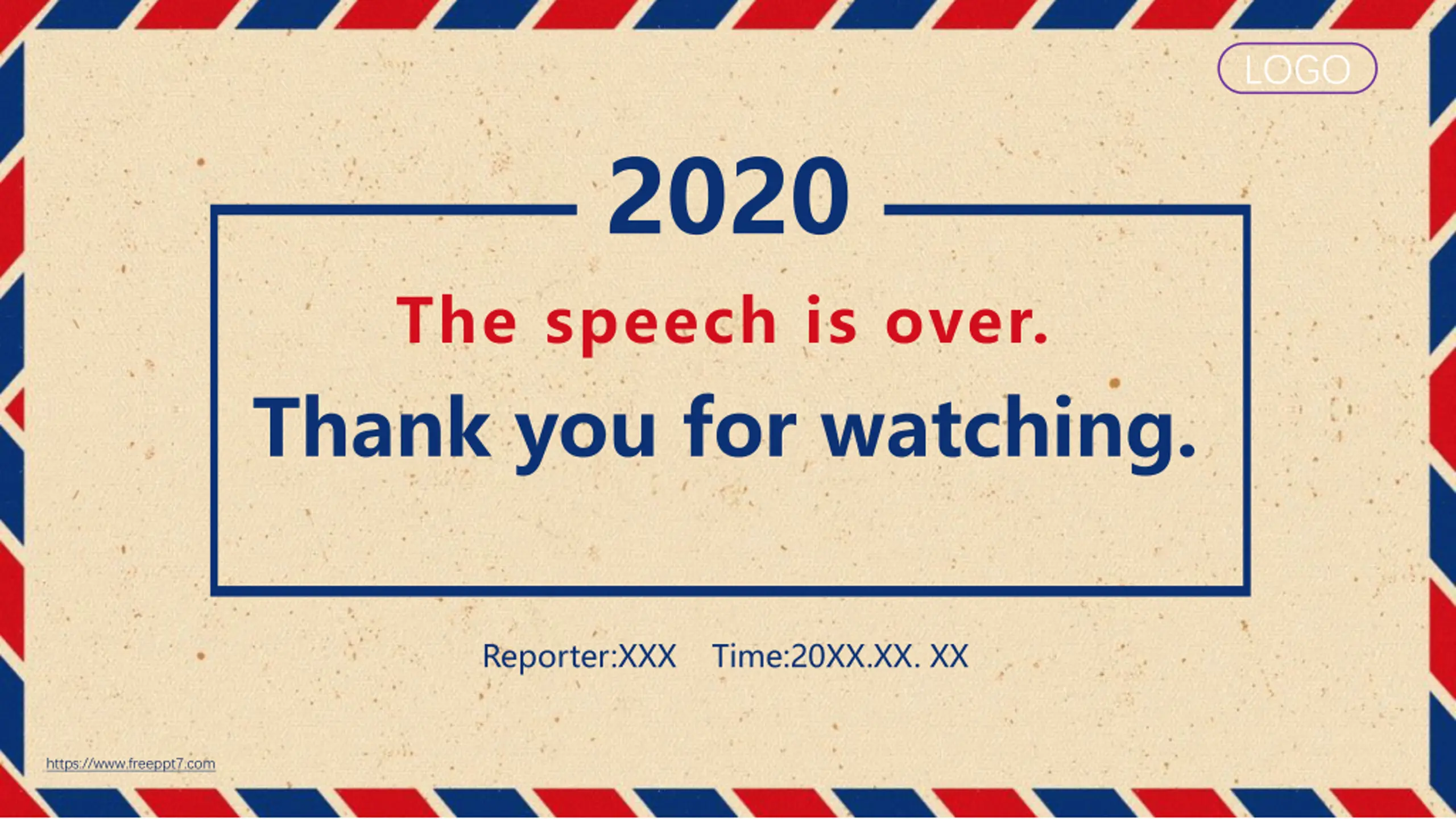 LOGO 2020 The speech is over. Thank you for watching. Reporter:XXX Time:20XX.XX. XX https://www.freeppt7.com https://www.freeppt7.com