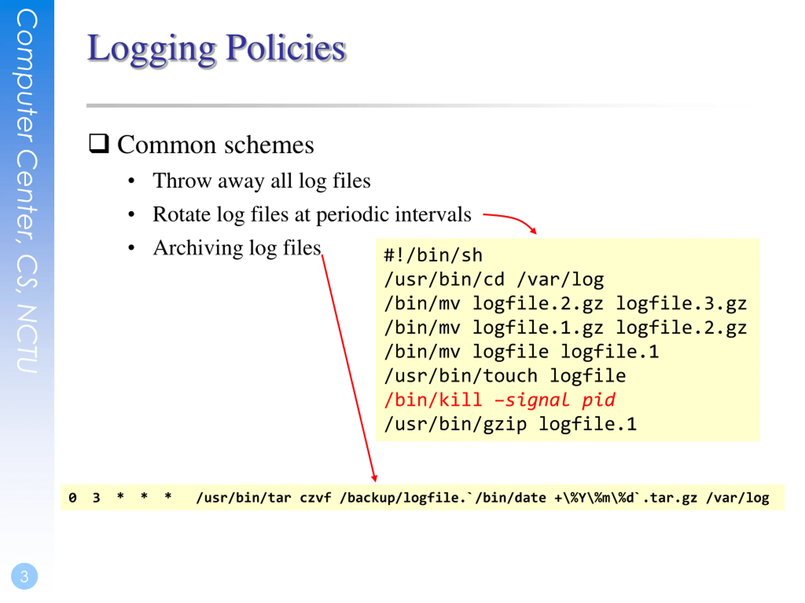 Computer Center, CS, NCTU Logging Policies Common schemes Throw away all log files Rotate log files at periodic intervals Archiving log files #!/bin/sh /usr/bin/cd /var/log /bin/mv logfile.2.gz logfile.3.gz /bin/mv logfile.1.gz logfile.2.gz /bin/mv logfile logfile.1 /usr/bin/touch logfile /bin/kill signal pid /usr/bin/gzip logfile.1 0 3 * * * /usr/bin/tar czvf /backup/logfile.`/bin/date +\%Y\%m\%d`.tar.gz /var/log 3