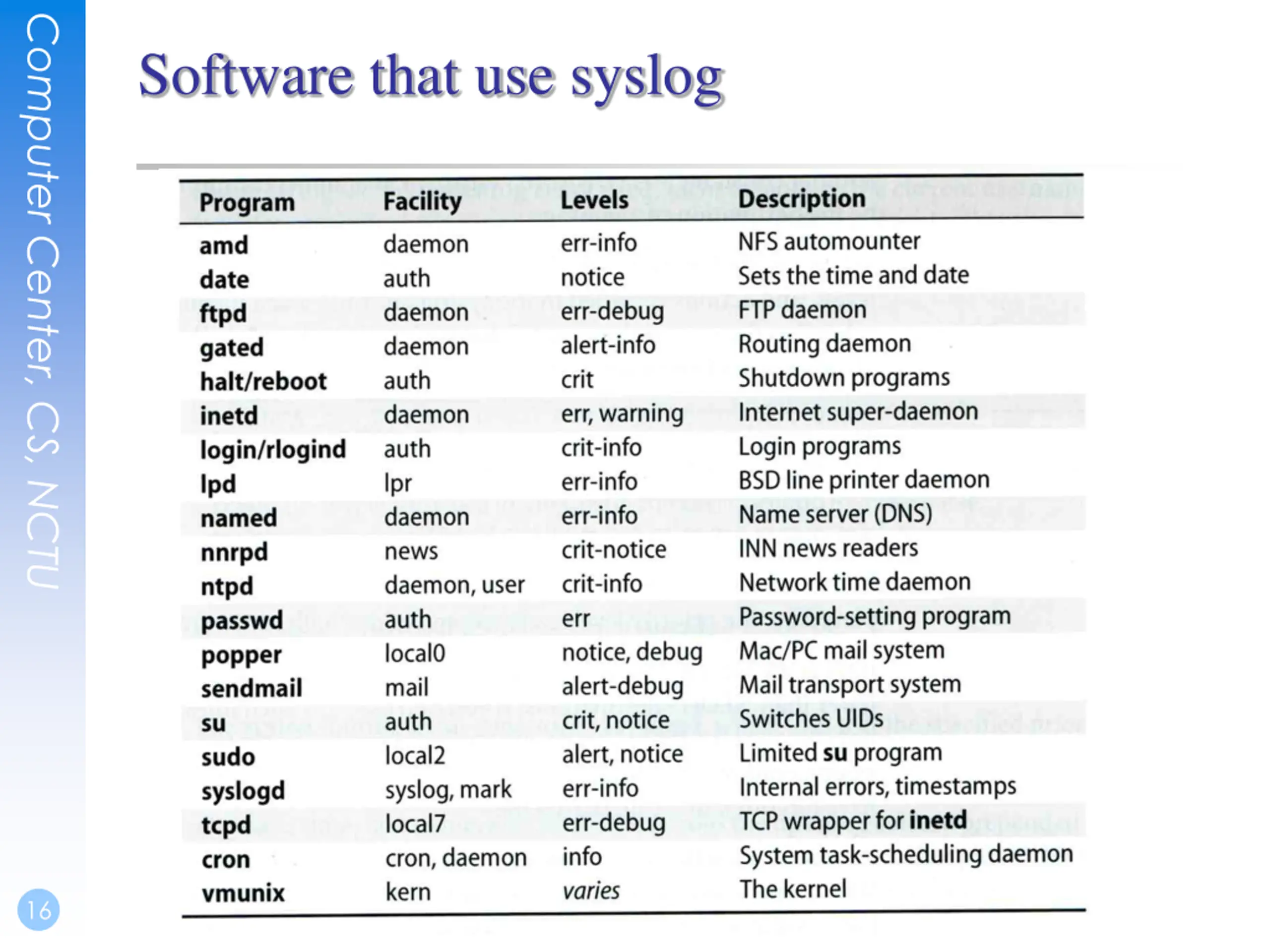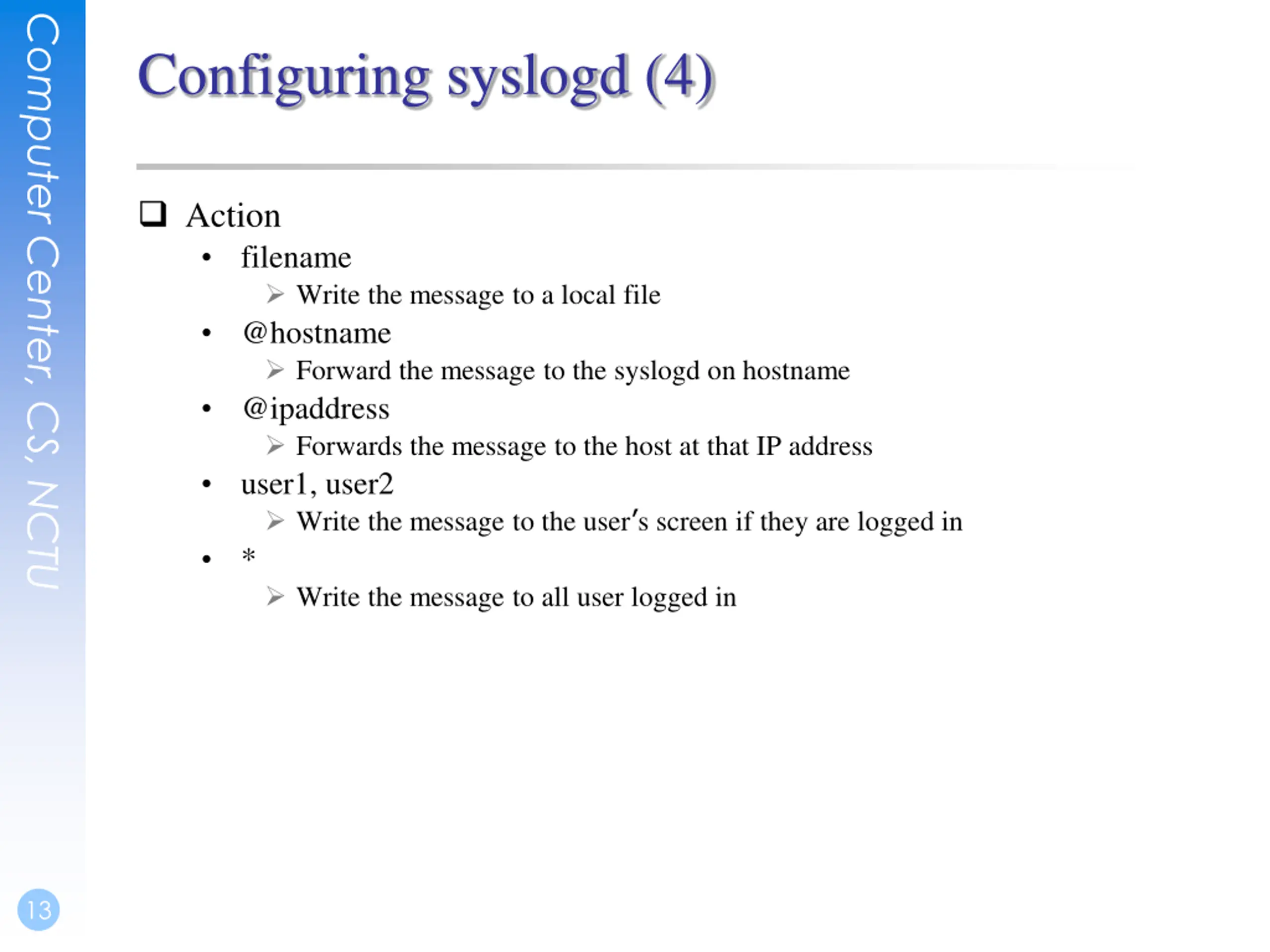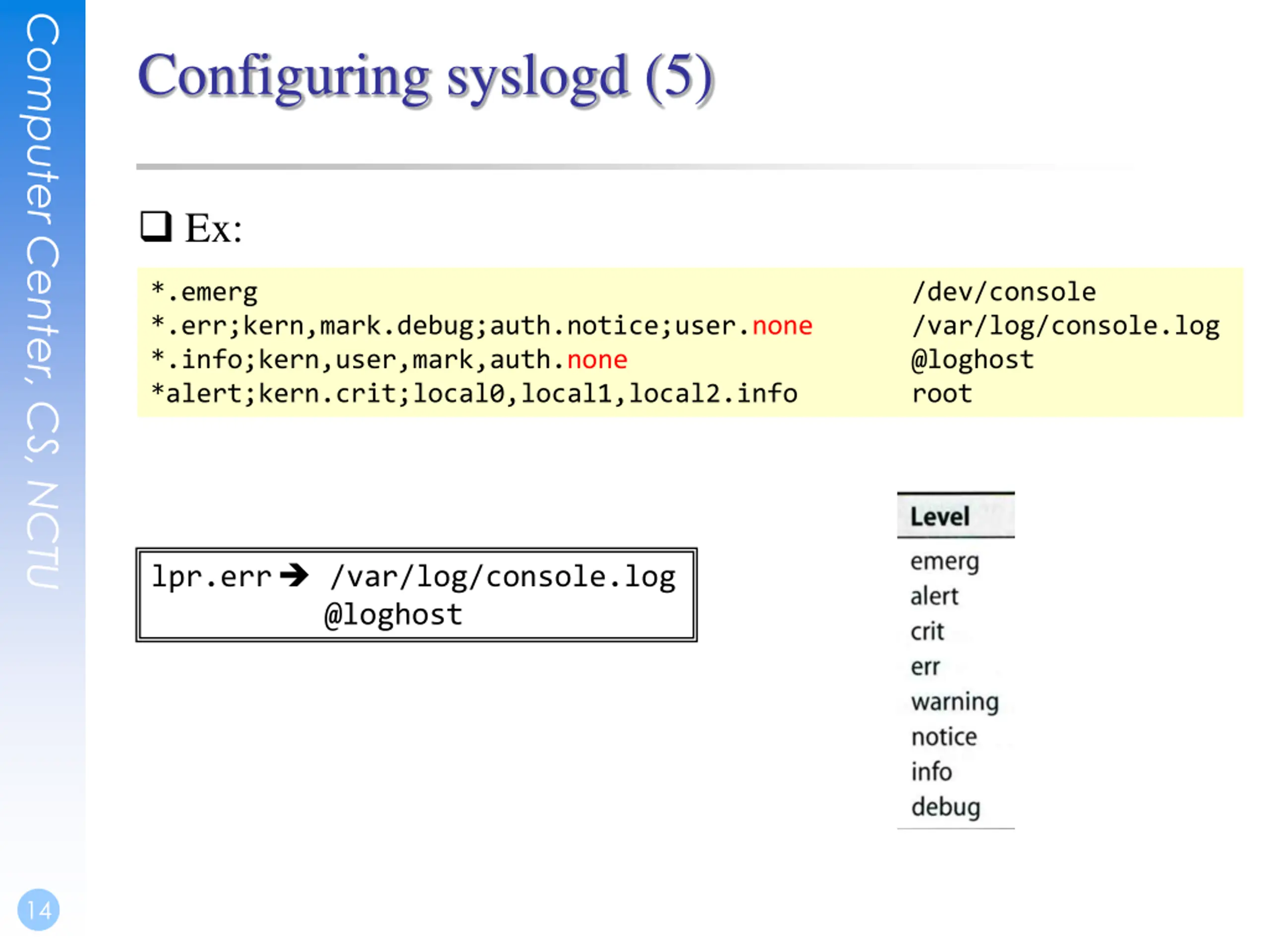 Computer Center, CS, NCTU Configuring syslogd (3) facility: auth, authpriv, console, cron, daemon, ftp, kern, lpr, mail, mark, news, ntp, security, syslog, user, uucp, and local0 through local7 12